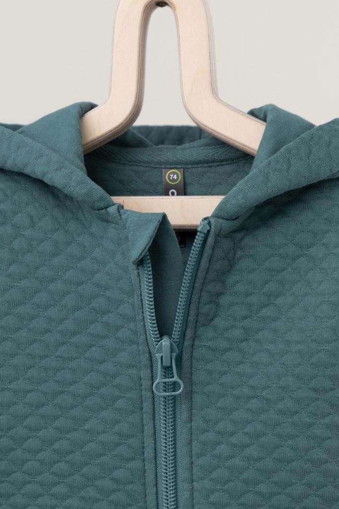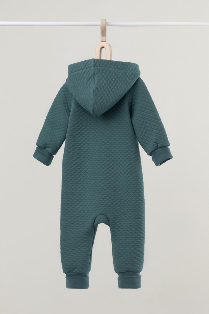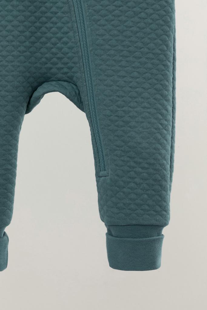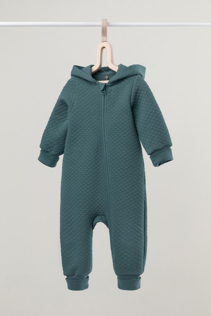 Тёплый комбинезон из капитония для новорождённых. Капитоний – это стёганое трикотажное полотно с утеплителем из полиэстеровой нити. Изделие застёгивается на молнию и имеет капюшон с подкладом из супрема. На рукавах и ножках эластичные манжеты из рибаны. Все трикотажные полотна производятся в соответствии с нормами Швейцарского сертификата ЭкоТекс.