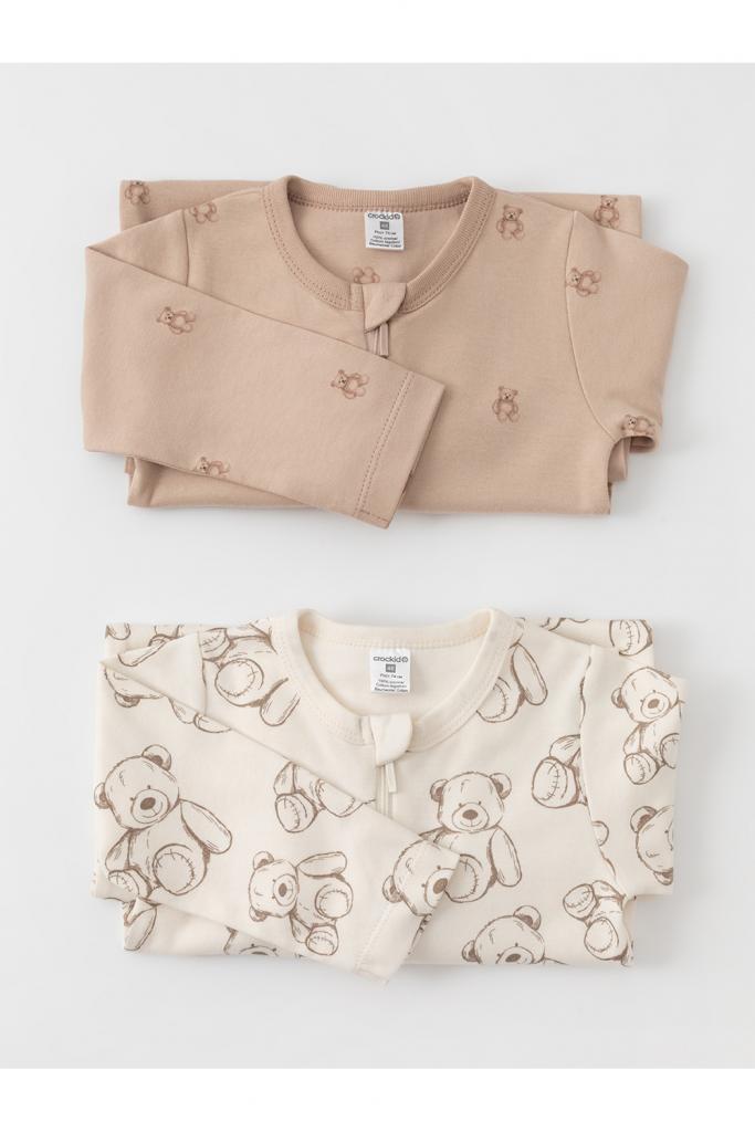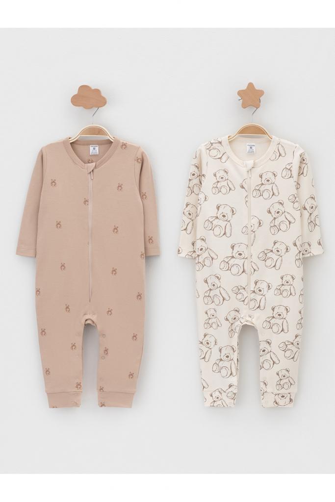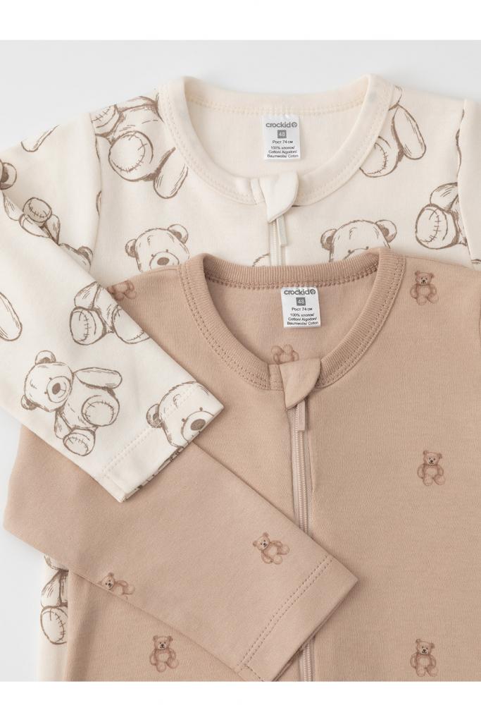 Комбинезоны для новорождённых из эластичного трикотажа, произведённого из натурального хлопка. В упаковке 2 штуки. Застёгиваются спереди на молнию с мягкой защитой шеи и подбородка. По шаговому шву застёжка на кнопки. Оригинальная набивка выполнена из стойких гипоаллергенных текстильных красителей. Все трикотажные полотна производятся в соответствии с нормами швейцарского сертификата ЭкоТекс.