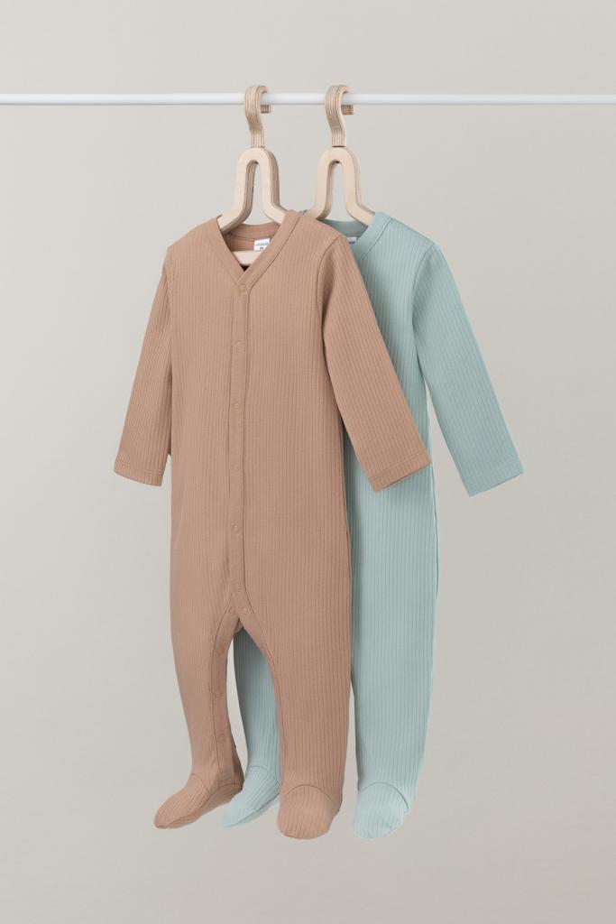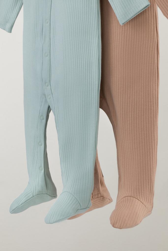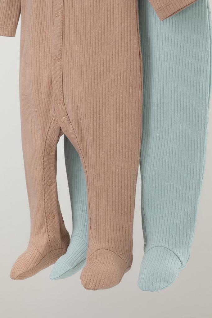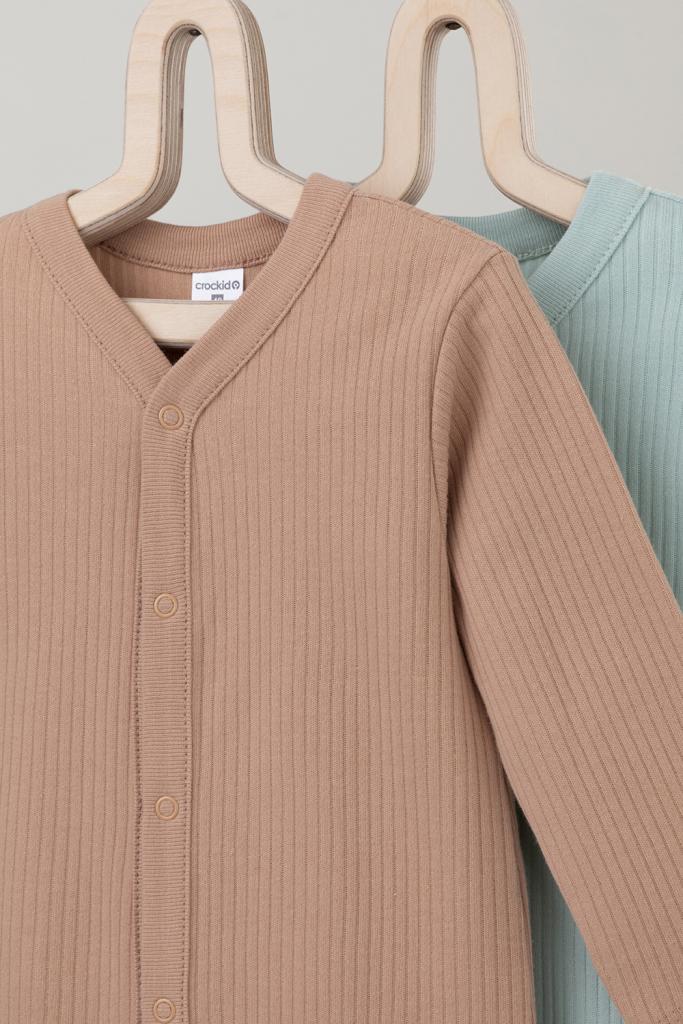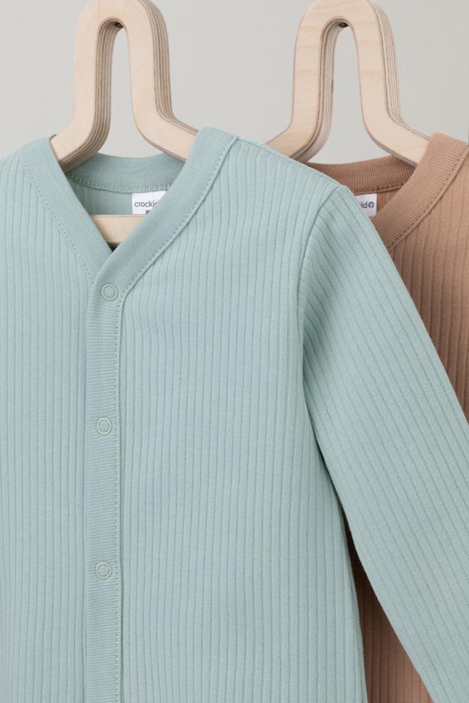 Комбинезоны для новорождённых из мягкого эластичного трикотажа, произведённого из натурального хлопка. В упаковке 2 штуки. Застёгиваются спереди на кнопки. В размере 56 на рукавах предусмотрены антицарапки, швы выполнены наружу. Все трикотажные полотна производятся в соответствии с нормами Швейцарского сертификата ЭкоТекс.