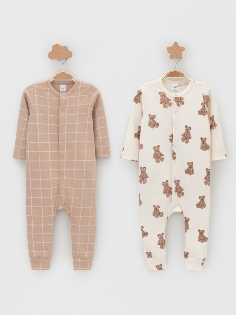 Комбинезоны для новорождённых из мягкого эластичного трикотажа, произведённого из натурального хлопка. В упаковке 2 штуки. Застёгиваются спереди на кнопки. Оригинальная набивка выполнена из стойких гипоаллергенных текстильных красителей. Все трикотажные полотна производятся в соответствии с нормами швейцарского сертификата ЭкоТекс.