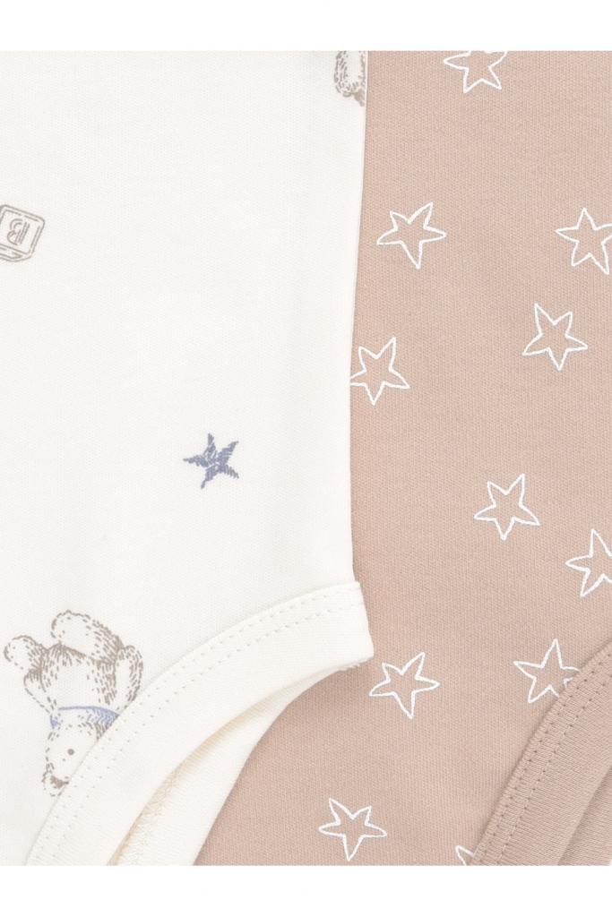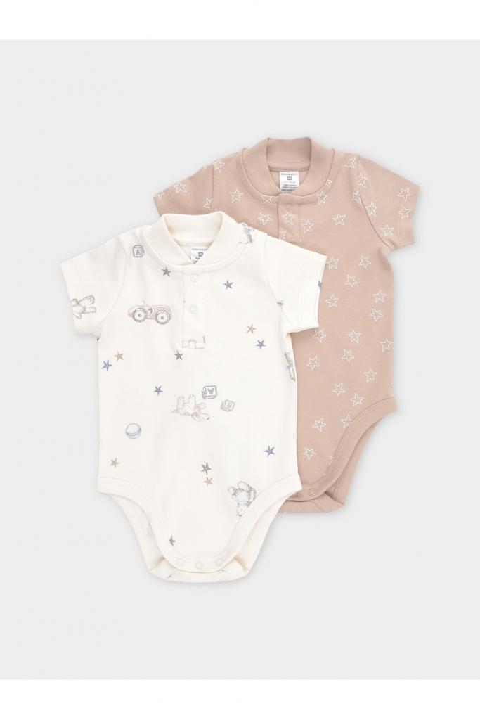 Боди для новорождённых из мягкого эластичного трикотажа, произведённого из натурального хлопка. В упаковке 2 штуки. Застёгиваются на кнопки спереди и по низу изделий. Оригинальная набивка выполнена из стойких гипоаллергенных текстильных красителей. Все трикотажные полотна производятся в соответствии с нормами швейцарского сертификата ЭкоТекс.