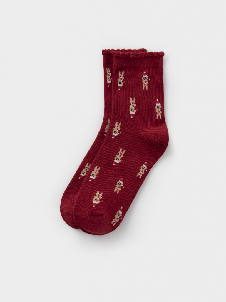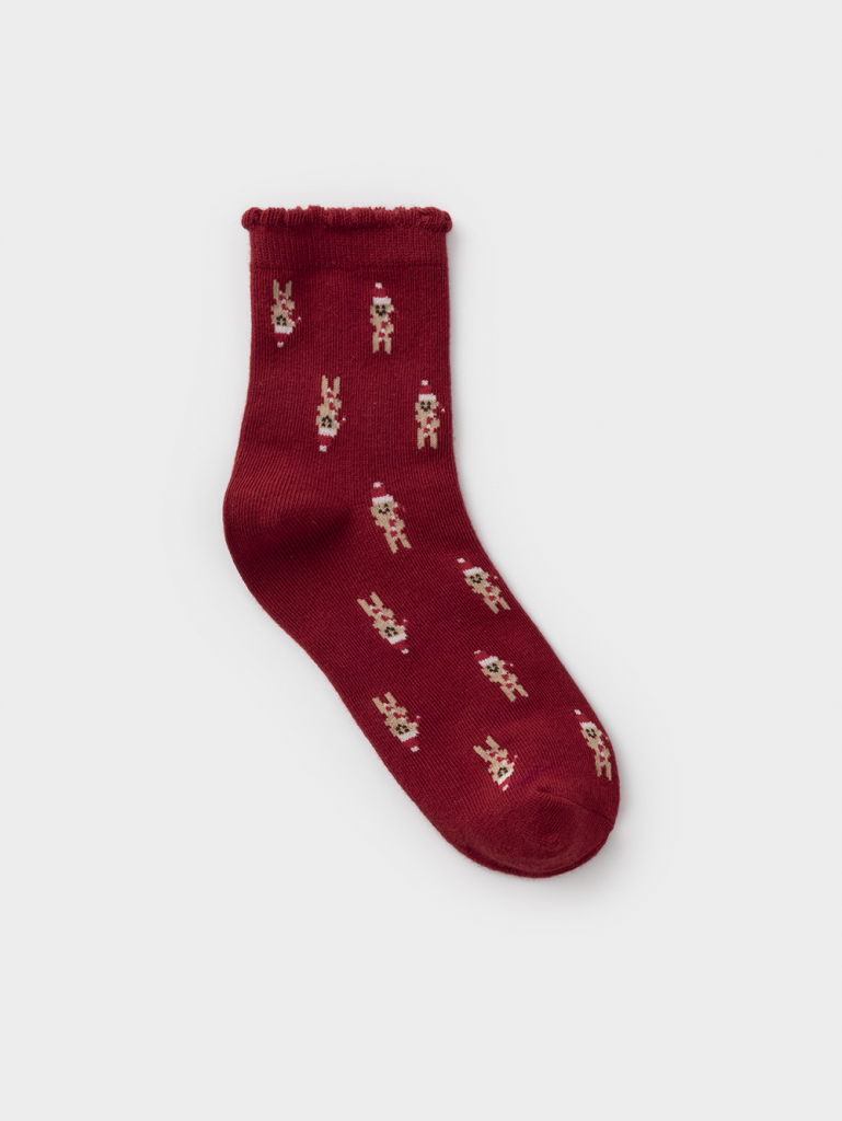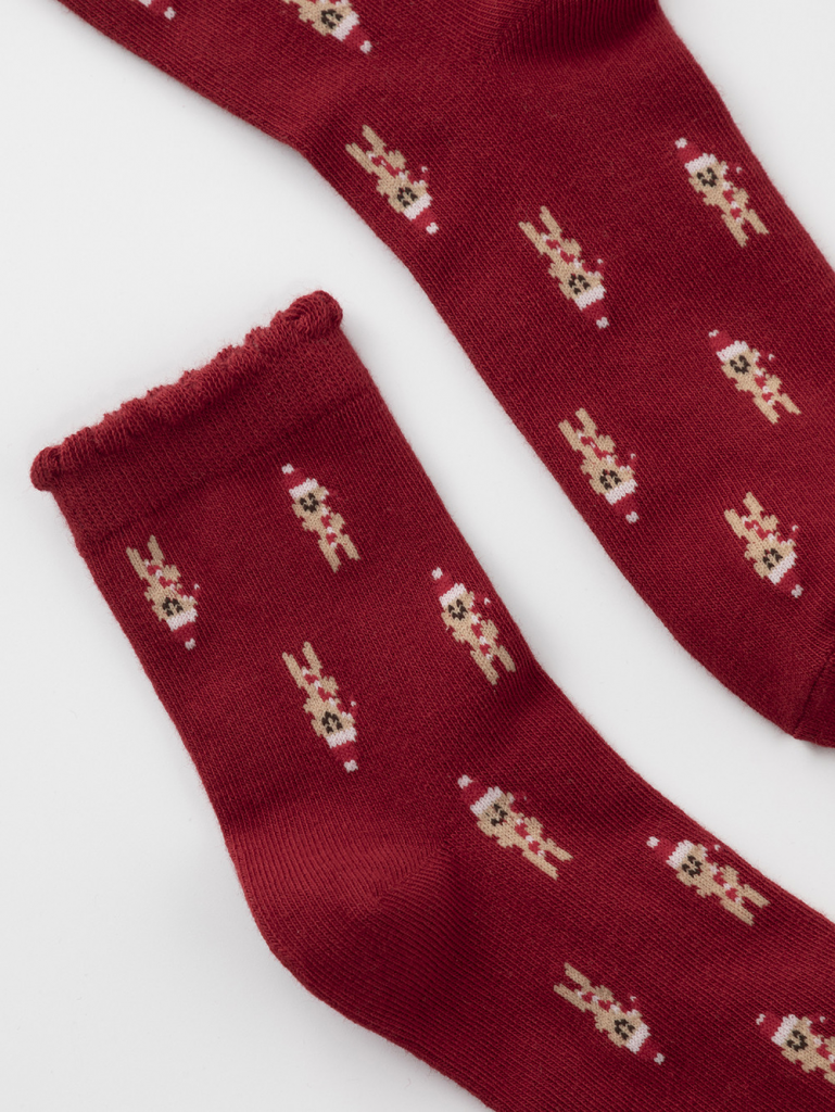 Носки короткие для девочки с формованной пяткой и эластичной резинкой по краю. Украшены рисунком. Отлично подойдут для создания праздничных образов или как дополнение к подарку на Новый год и Рождество. Изделие сохраняет форму и стойкий цвет после многочисленных стирок.