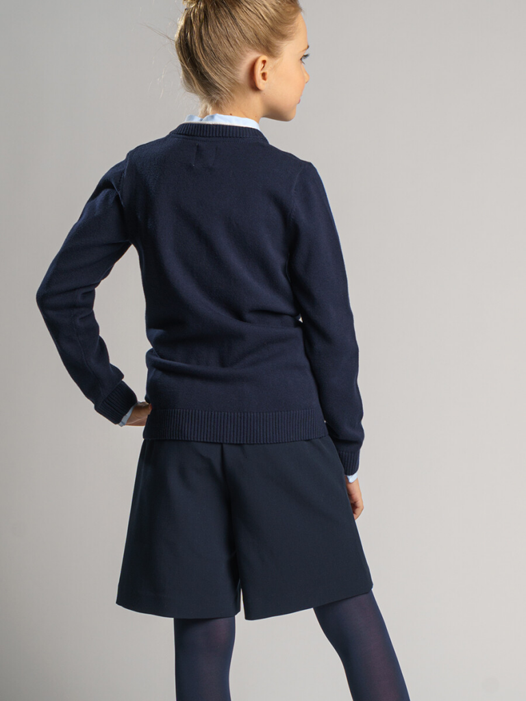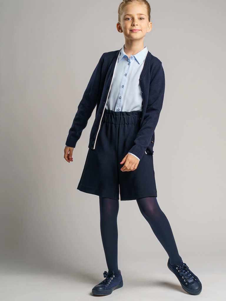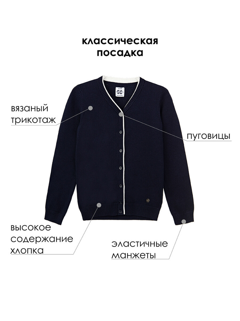 Классический синий школьный кардиган для девочки подростка. Кардиган прямого силуэта на пуговицах выполнен из вязаного трикотажа с высоким содержанием хлопка. Кофта в школу выглядит стильно, благодаря лаконичному дизайну. С любой рубашкой, футболкой или поло, кардиган для школьницы составит красивый элегантный комплект для школы.