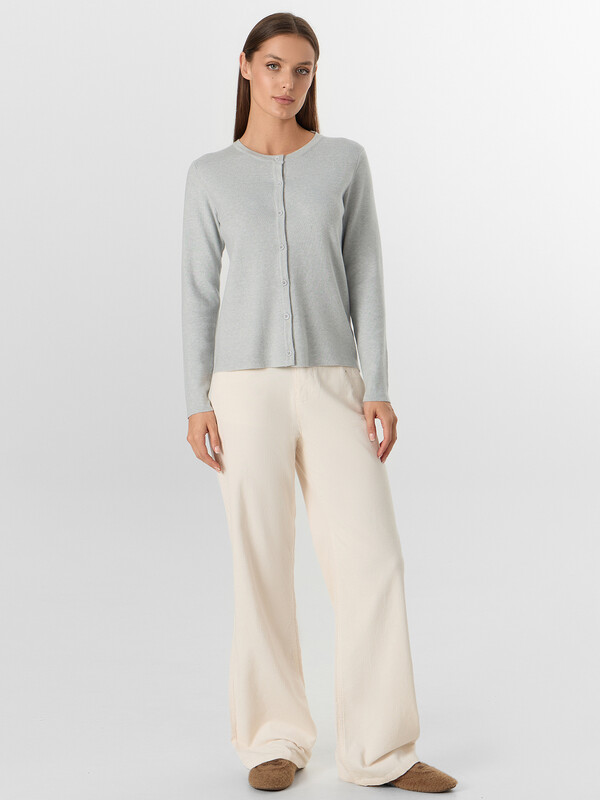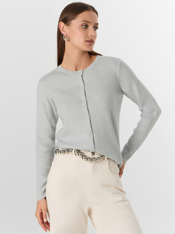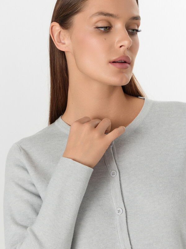 Серый кардиган на пуговицах — идеальный способ добавить уют и элегантность в повседневный образ. Модель с круглым вырезом и классической застежкой на пуговицах легко сочетается с любой базой. Мягкая смесь вискозы и нейлона обеспечивает комфорт: материал приятен к телу, хорошо сохраняет тепло и при этом отличается легкостью, сохраняя форму после стирок.
