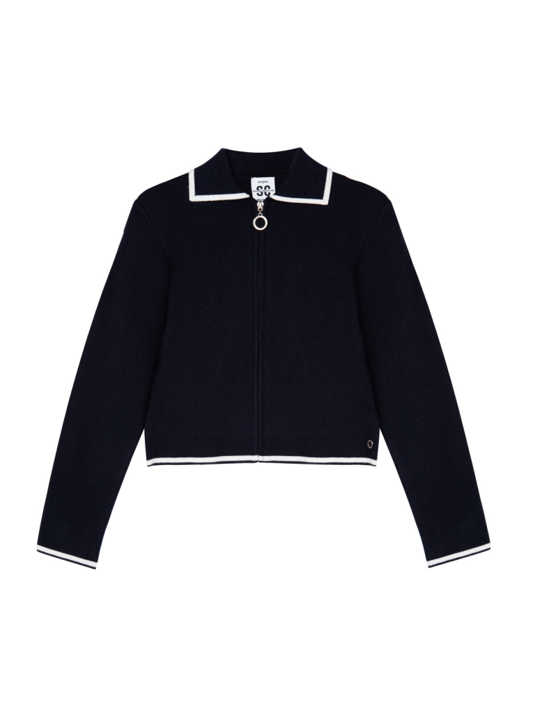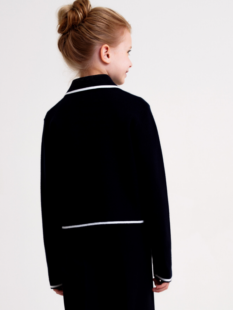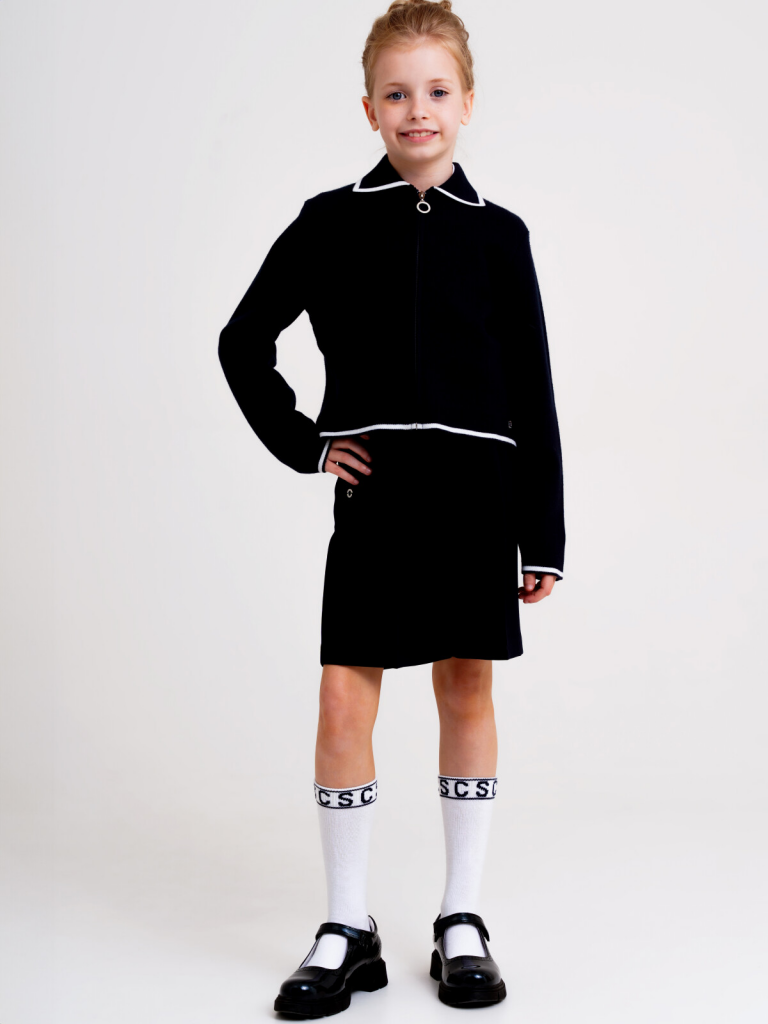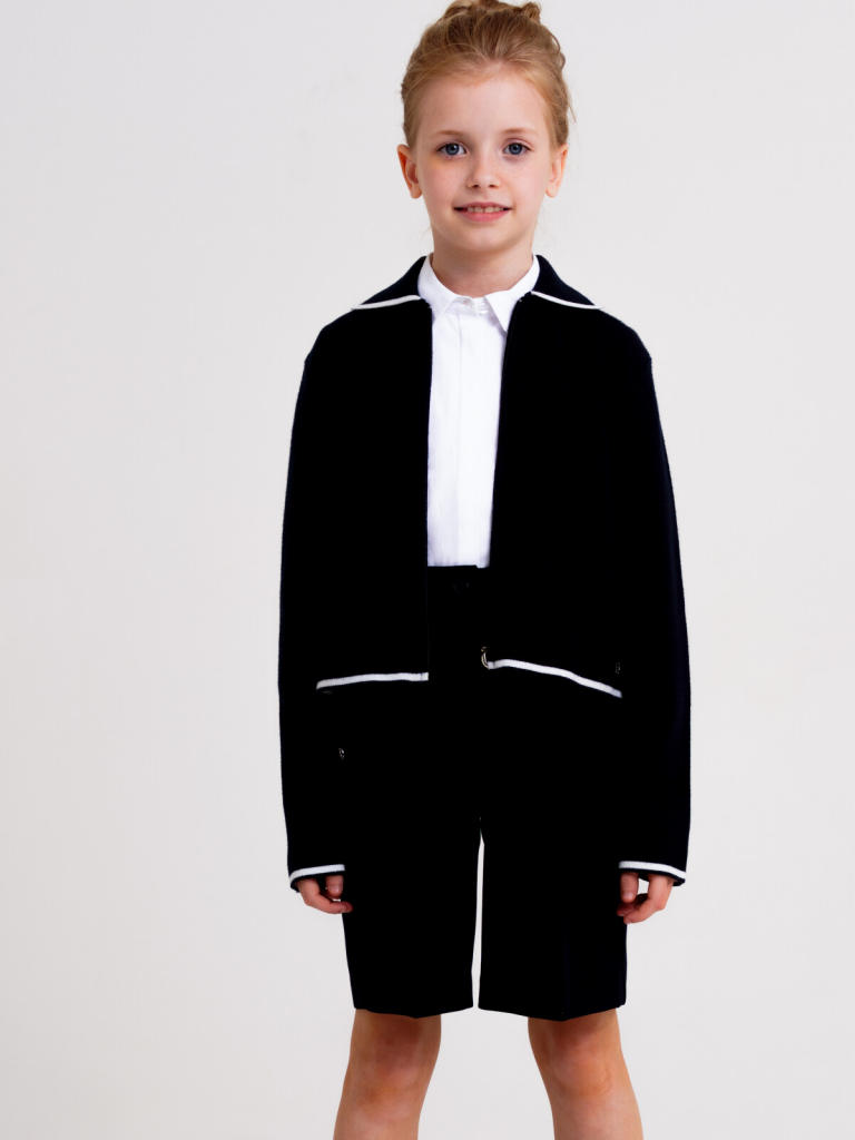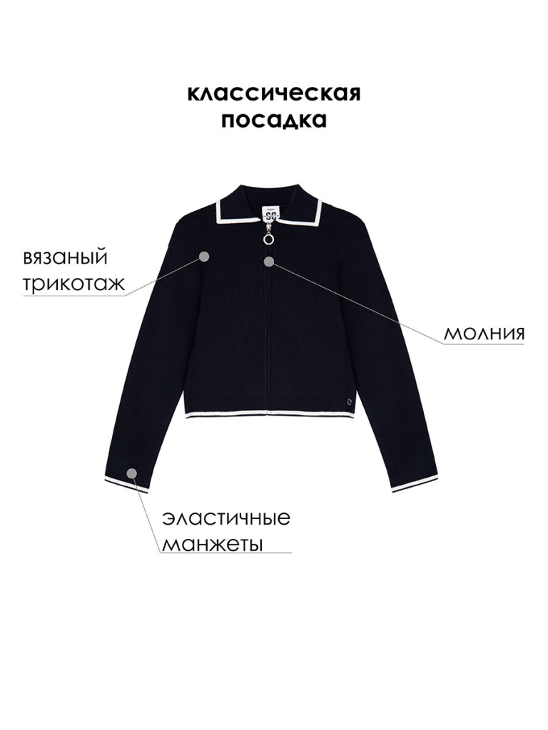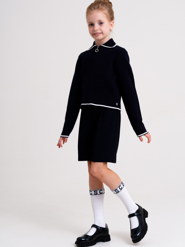 Укороченный синий школьный кардиган для девочки подростка. Кардиган прямого силуэта на молнии выполнен из вязаного трикотажа с содержанием вискозы. Кофта в школу выглядит стильно, благодаря лаконичному дизайну. Рубашка, футболка или поло + кардиган для школьницы составят красивый элегантный комплект для школы.