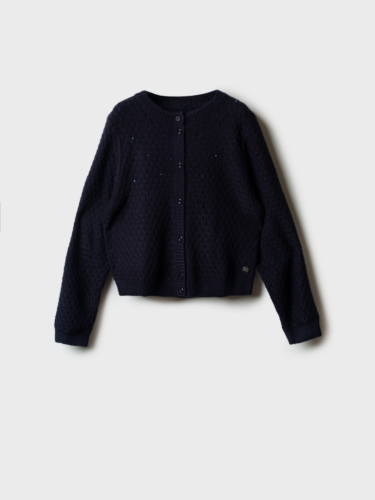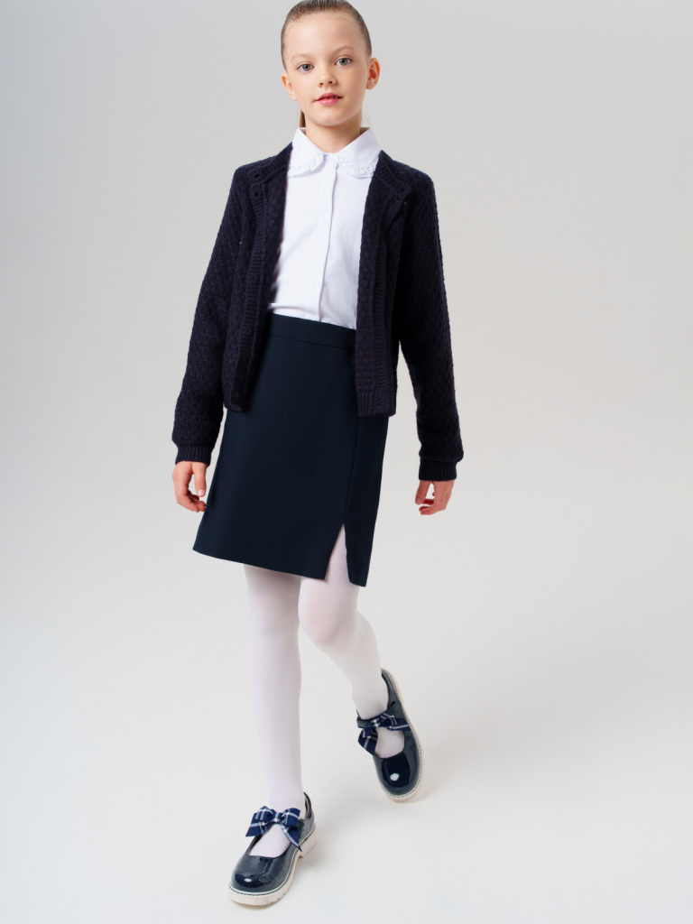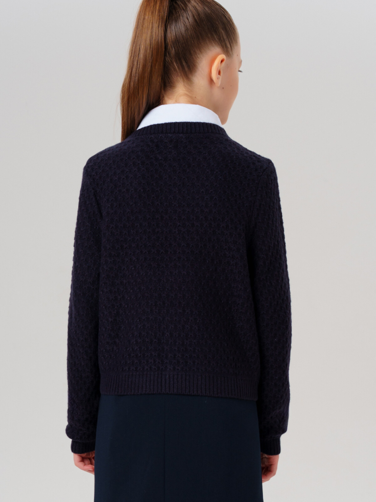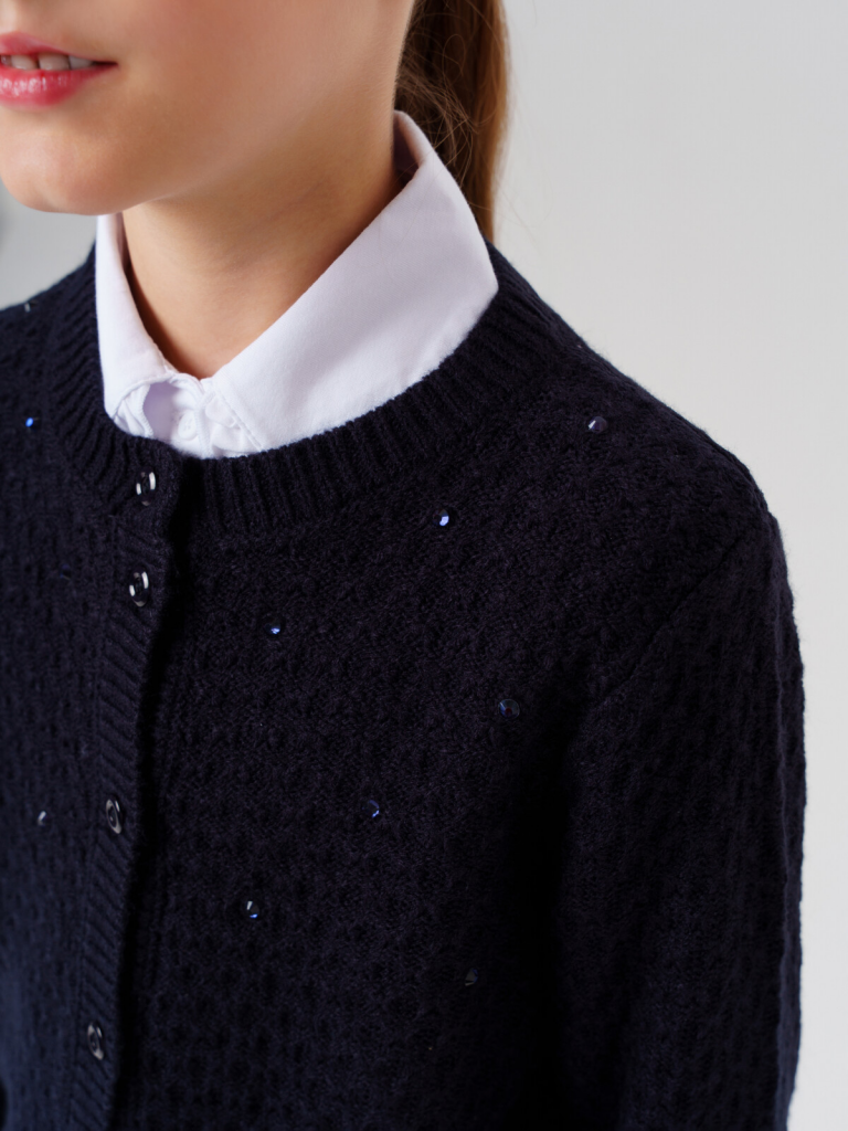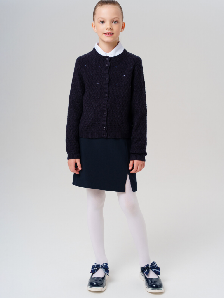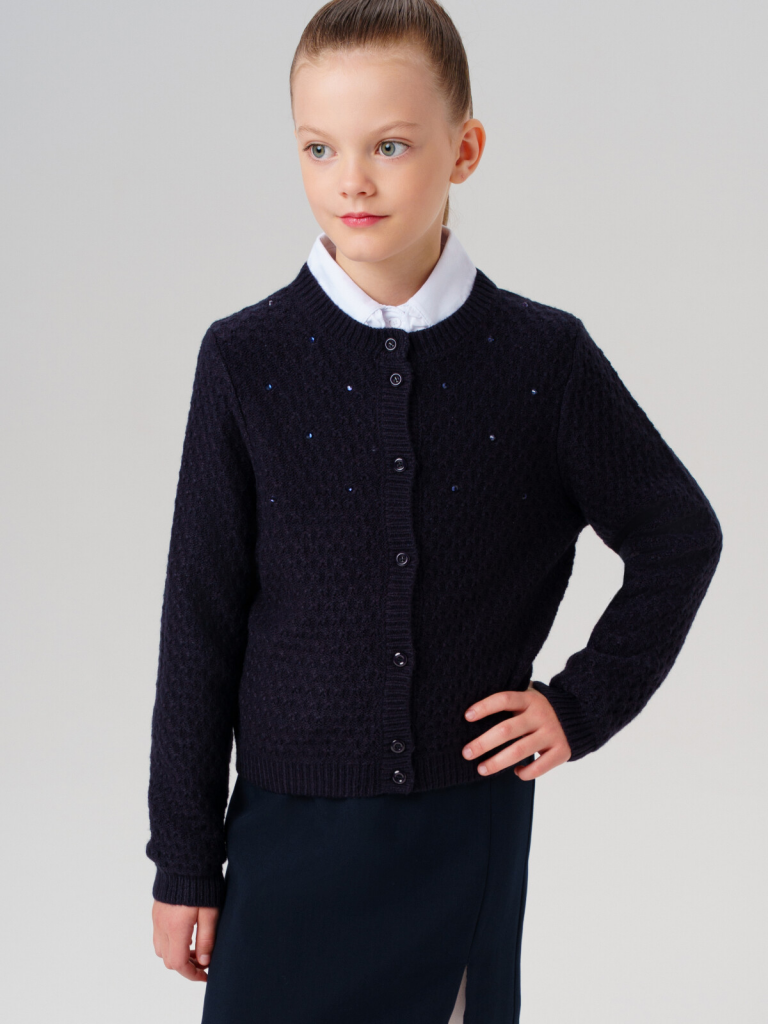 Стильный школьный темно-синий кардиган на пуговицах для девочки-подростка.Этот модный кардиган для школы станет универсальным элементом гардероба юной модницы. Модель выполнена в базовом силуэте - классический крой обеспечивает комфорт в движении и современный внешний вид.Ключевые особенности:+ Застежка на пуговицы+ Декор из стразПочему стоит выбрать:Идеально подходит для школы - сочетает удобство и аккуратный внешний видУдобный классический крой не сковывает движенияСтильный дизайн понравится подросткам, следящим за модойОтличный вариант для повседневной носки и школьных будней. Качественные материалы и продуманный крой делают этот кардиган практичным выбором для девочки-школьницы.