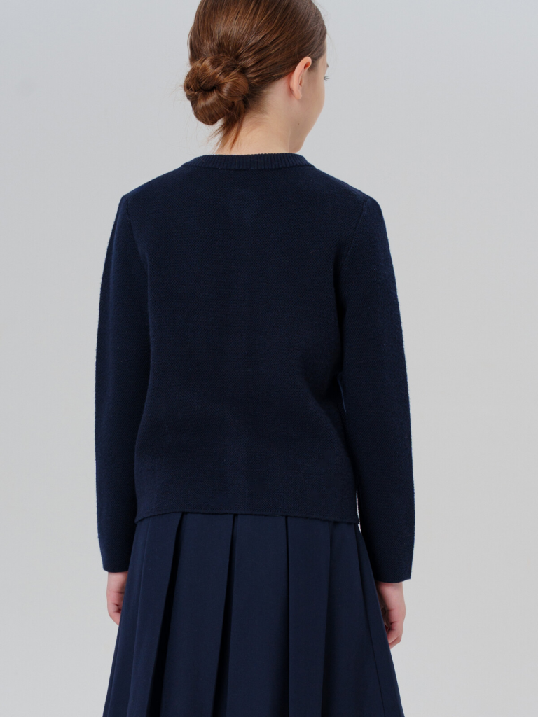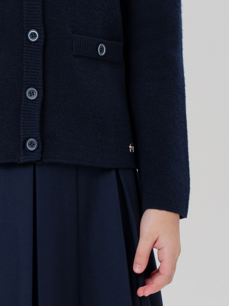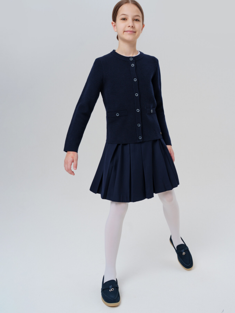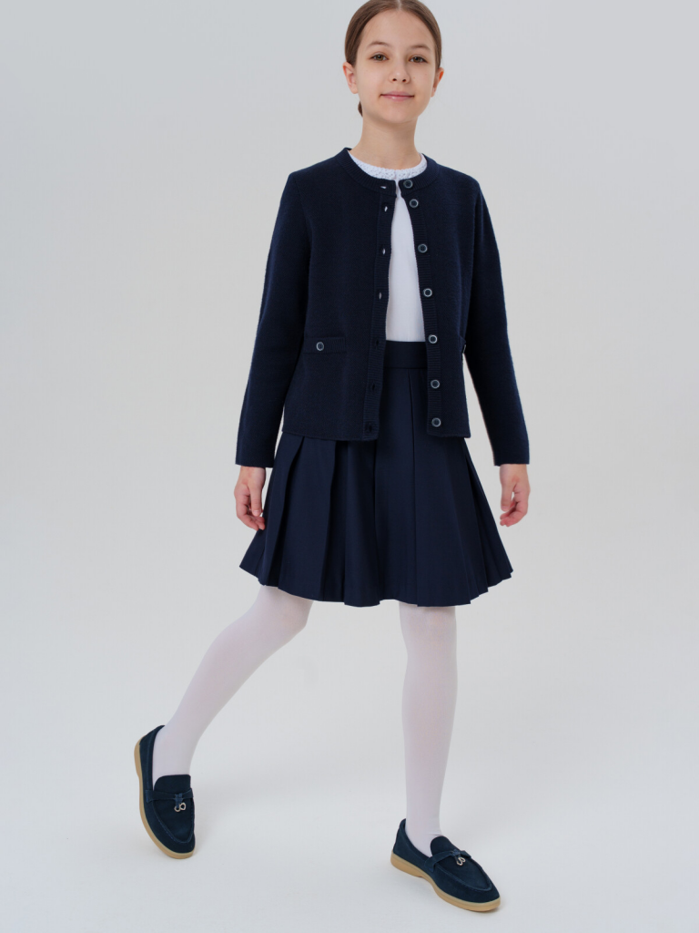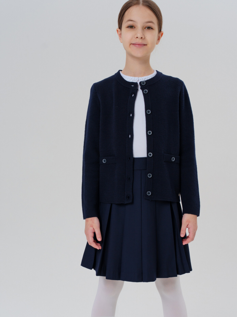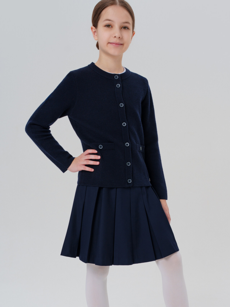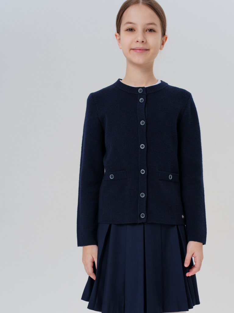 Стильный школьный темно-синий кардиган на пуговицах для девочки-подростка.Этот модный кардиган для школы станет универсальным элементом гардероба юной модницы. Модель выполнена в базовом силуэте - классический крой обеспечивает комфорт в движении и современный внешний вид.Ключевые особенности:+ Застежка на пуговицы+ Декоративные карманыПочему стоит выбрать:Идеально подходит для школы - сочетает удобство и аккуратный внешний видУдобный классический крой не сковывает движенияСтильный дизайн понравится подросткам, следящим за модойОтличный вариант для повседневной носки и школьных будней. Качественные материалы и продуманный крой делают этот кардиган практичным выбором для девочки-школьницы.
