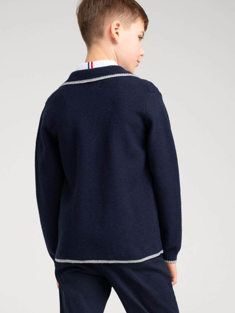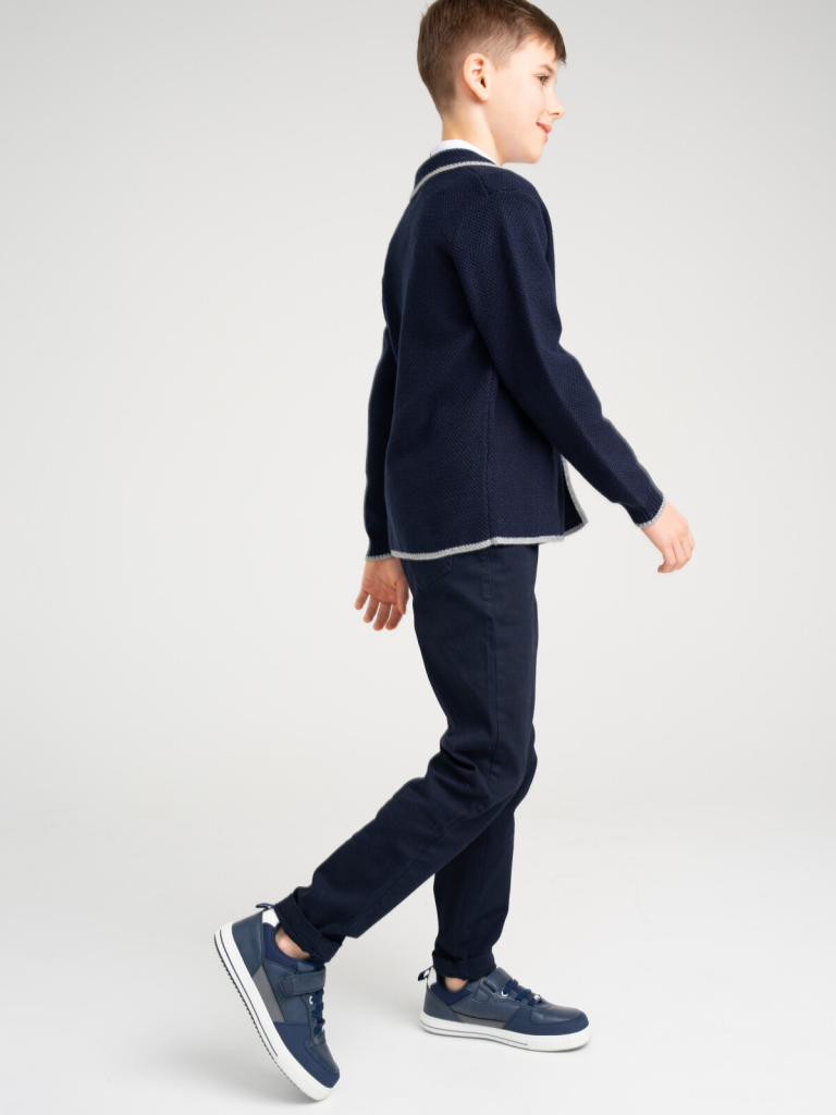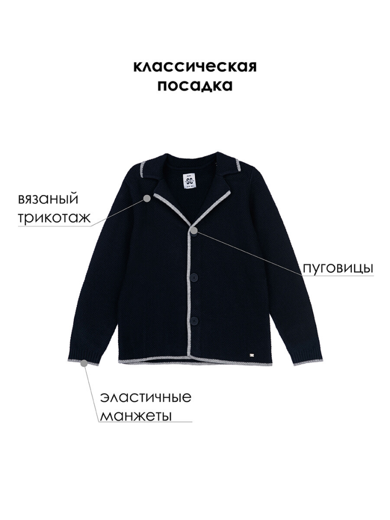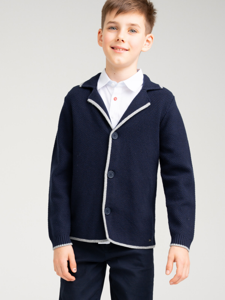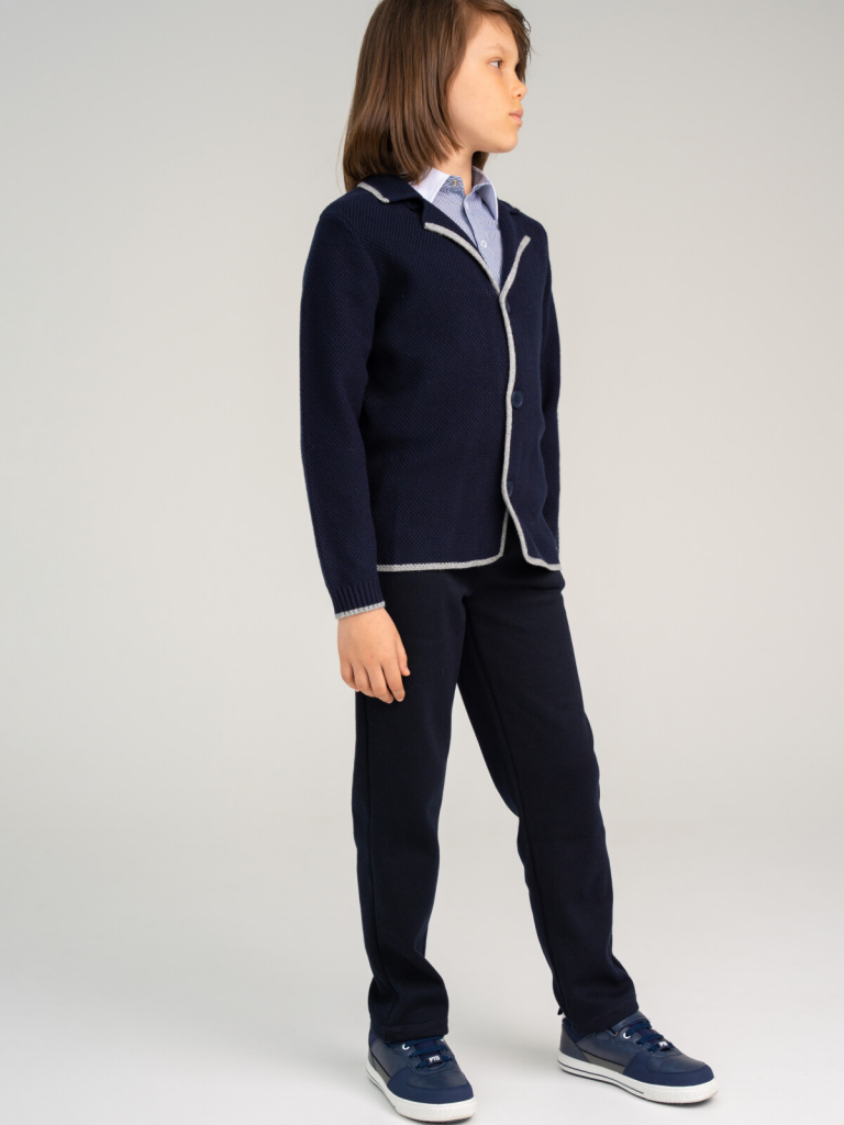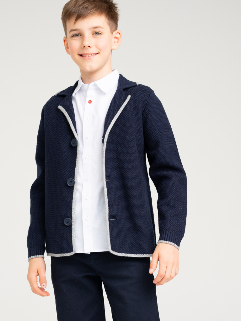 Классический синий школьный пиджак для мальчика подростка. Пиджак прямого силуэта на пуговицах выполнен из вязаного трикотажа с высоким содержанием акрила. Кофта в школу выглядит стильно, благодаря лаконичному дизайну. Рубашка, футболка или поло + пиджак для школьника составят красивый элегантный комплект для школы.