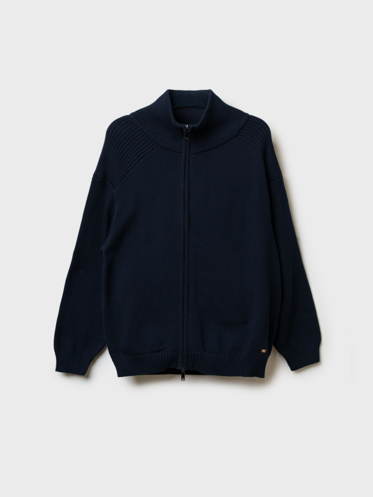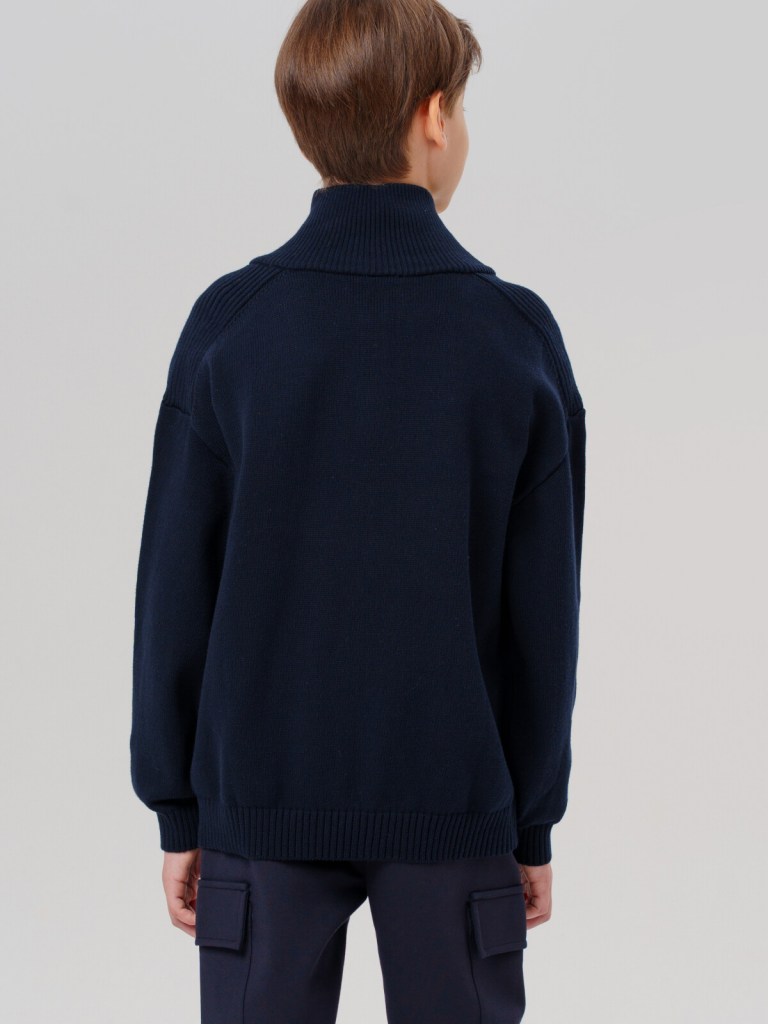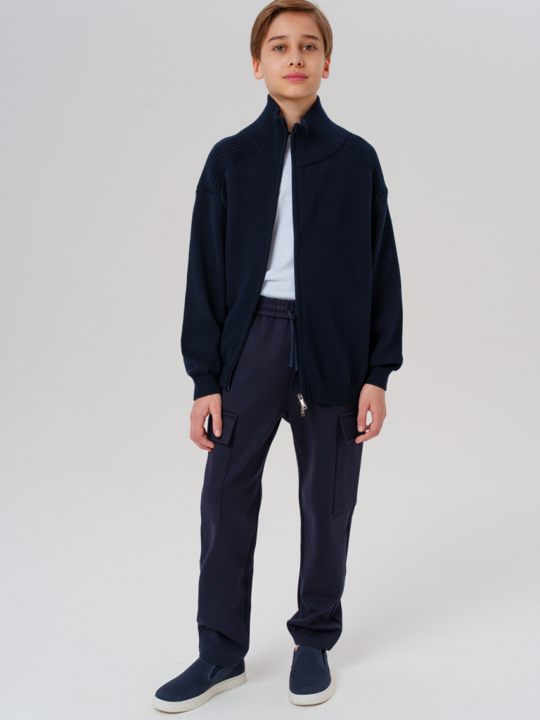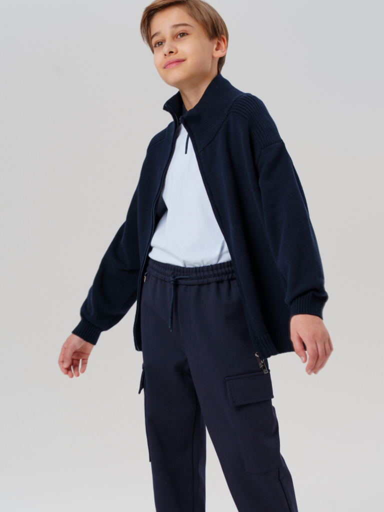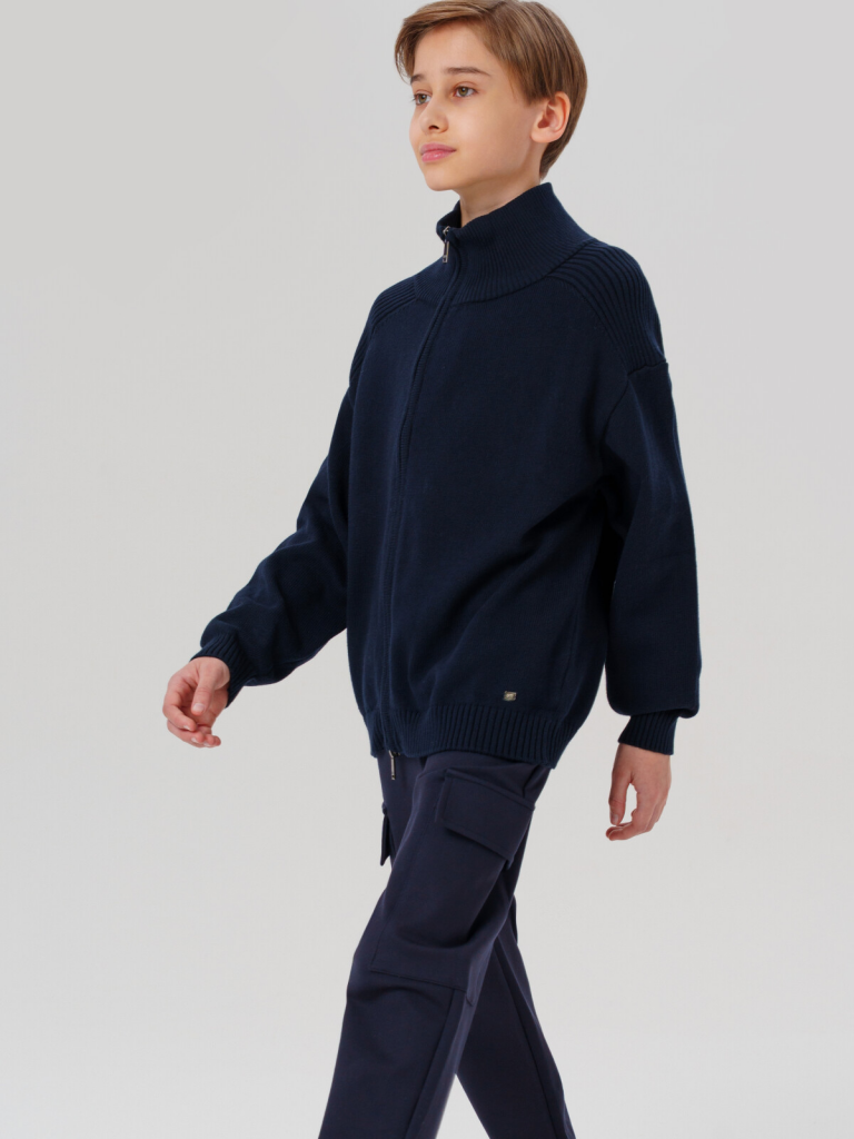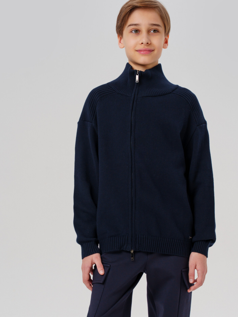 Стильный школьный темно-синий кардиган для мальчика-подростка.Этот модный кардиган для школы с нестандартным дизайном станет универсальным элементом гардероба юного стиляги. Модель выполнена в оверсайз-силуэте - свободный крой обеспечивает комфорт в движении и современный внешний вид.Ключевые особенности:+ Смещённая вправо молния с двумя замками - необычный дизайн и функциональность+ Воротник-стойка - защищает от ветра и добавляет стильный акцентПочему стоит выбрать:Идеально подходит для школы - сочетает удобство и аккуратный внешний видУдобный оверсайз-крой не сковывает движенияСтильный дизайн понравится подросткам, следящим за модойОтличный вариант для повседневной носки и школьных будней. Качественные материалы и продуманный крой делают этот кардиган практичным выбором для мальчика-школьника.