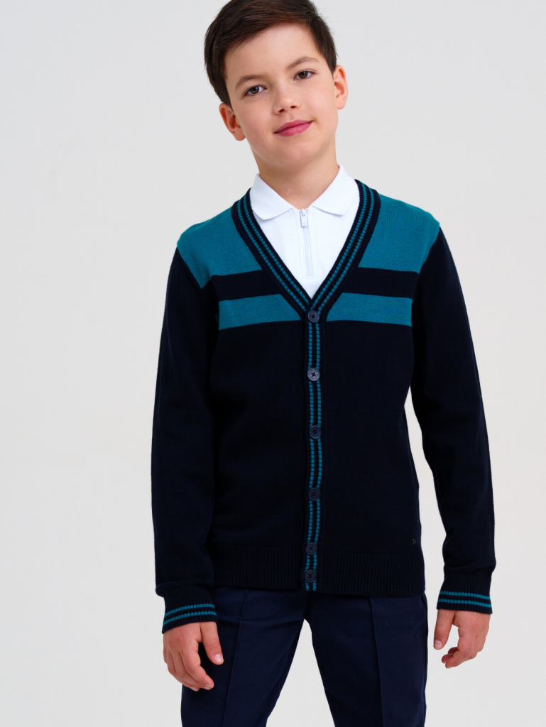 Классический синий школьный кардиган для мальчика подростка. Кардиган прямого силуэта на молнии выполнен из вязаного трикотажа с содержанием хлопка. Кофта в школу выглядит стильно, благодаря лаконичному дизайну. Рубашка, футболка или поло + кардиган для школьника составят красивый элегантный комплект для школы.