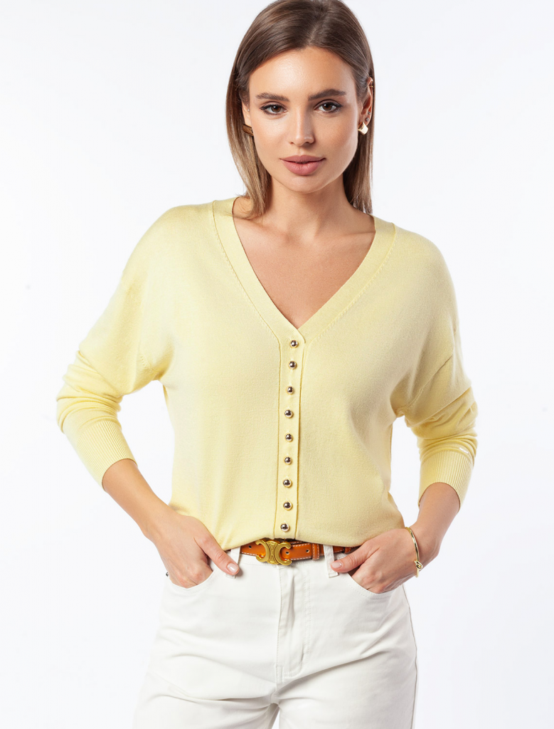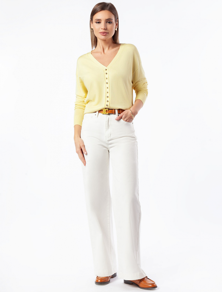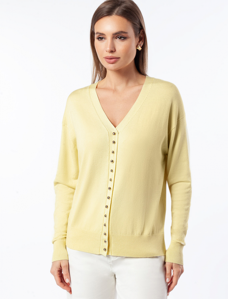 Кардиган тонкой вязки выполнен из нежной пряжи вискозы с нейлоном. Лаконичный силуэт дополнен яркой фишкой изделия - ряд золотистых пуговиц, визуально вытягивающий силуэт. Очень приятное к телу изделие, в котором будет не жарко даже в самые теплые дни. Изделие дополнено логотипом бренда.