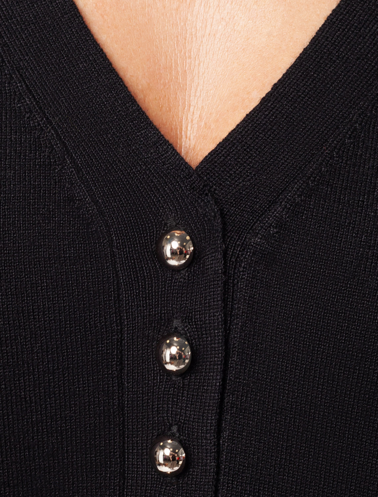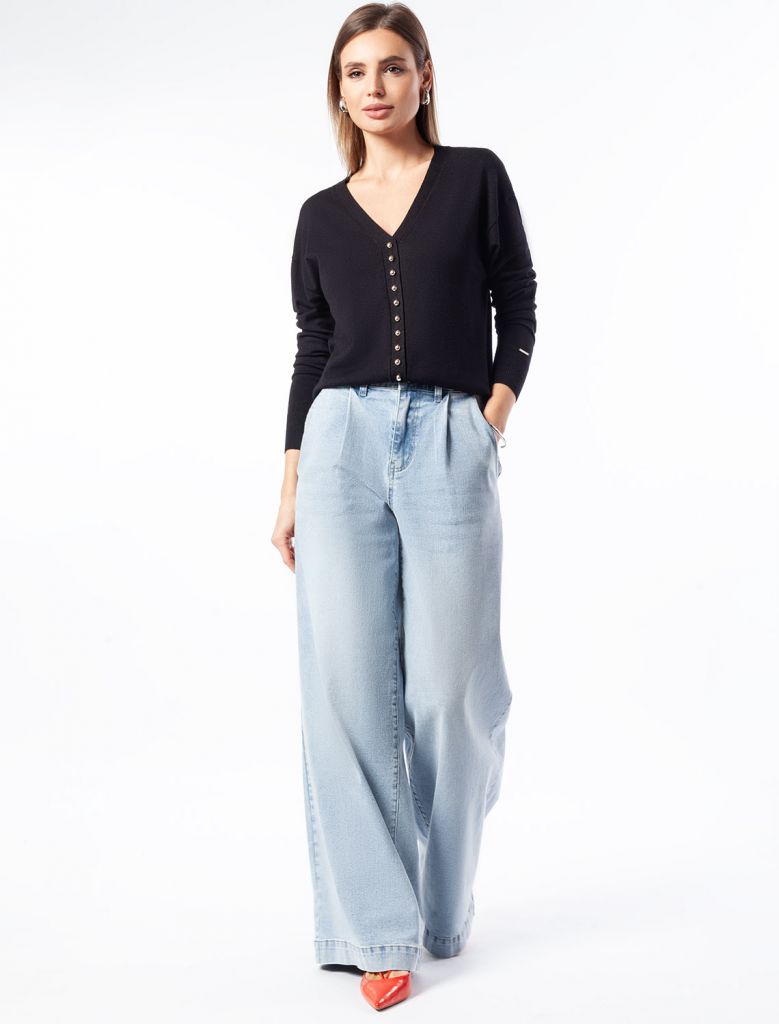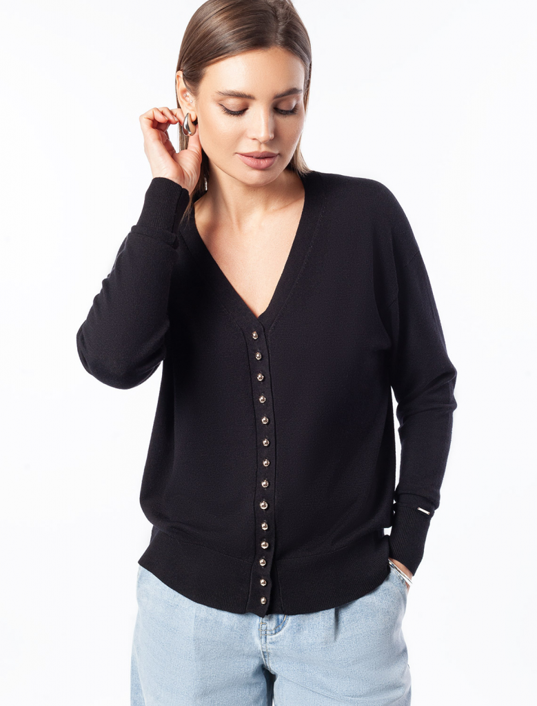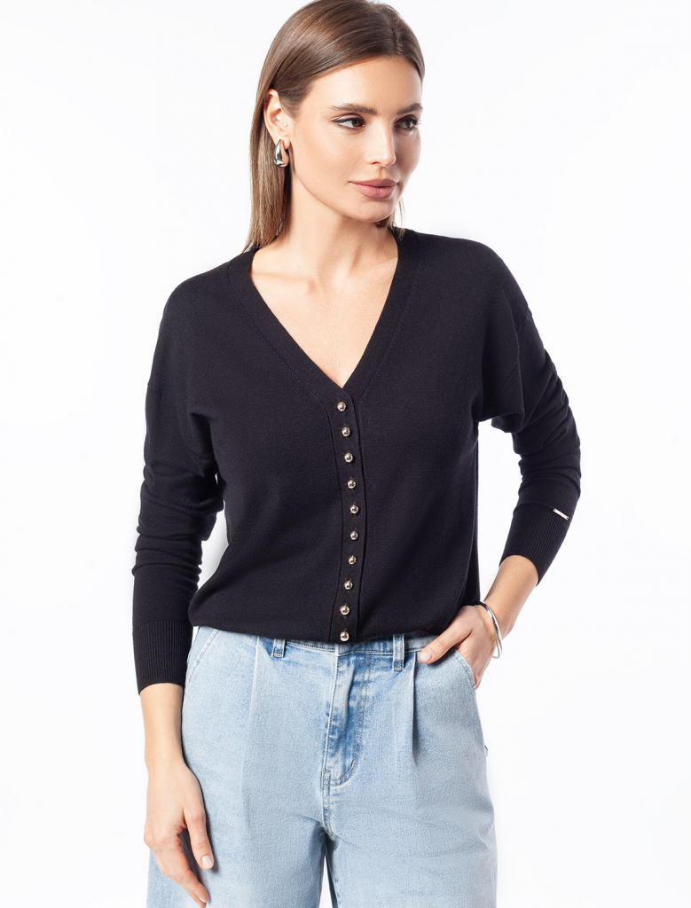 Кардиган тонкой вязки выполнен из нежной пряжи вискозы с нейлоном. Лаконичный силуэт дополнен яркой фишкой изделия - ряд золотистых пуговиц, визуально вытягивающий силуэт. Очень приятное к телу изделие, в котором будет не жарко даже в самые теплые дни. Изделие дополнено логотипом бренда.
