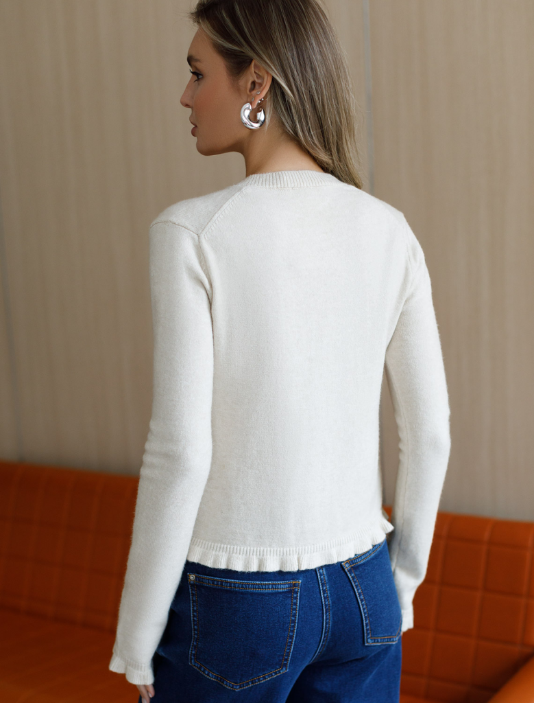 Кардиган выполнен из мягкой меланжевой пряжи с Романтичности прямому силуэту добавляют мягкие воланы по линии пуговиц, на манжетах и краю изделия. Застежка на пуговицы из натурального перламутра. Изделие очень приятное к телу, совершенно не колется и отлично сохраняет тепло. Сочетается в костюме с брюками D38.013, D38.012 и юбкой D36.016