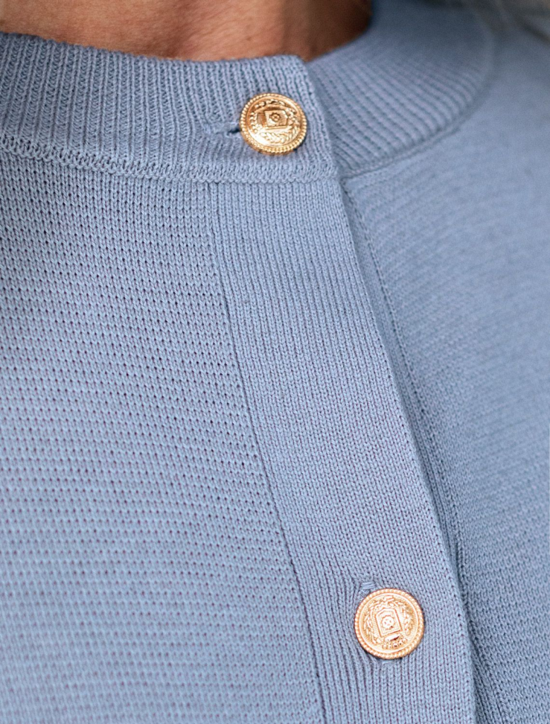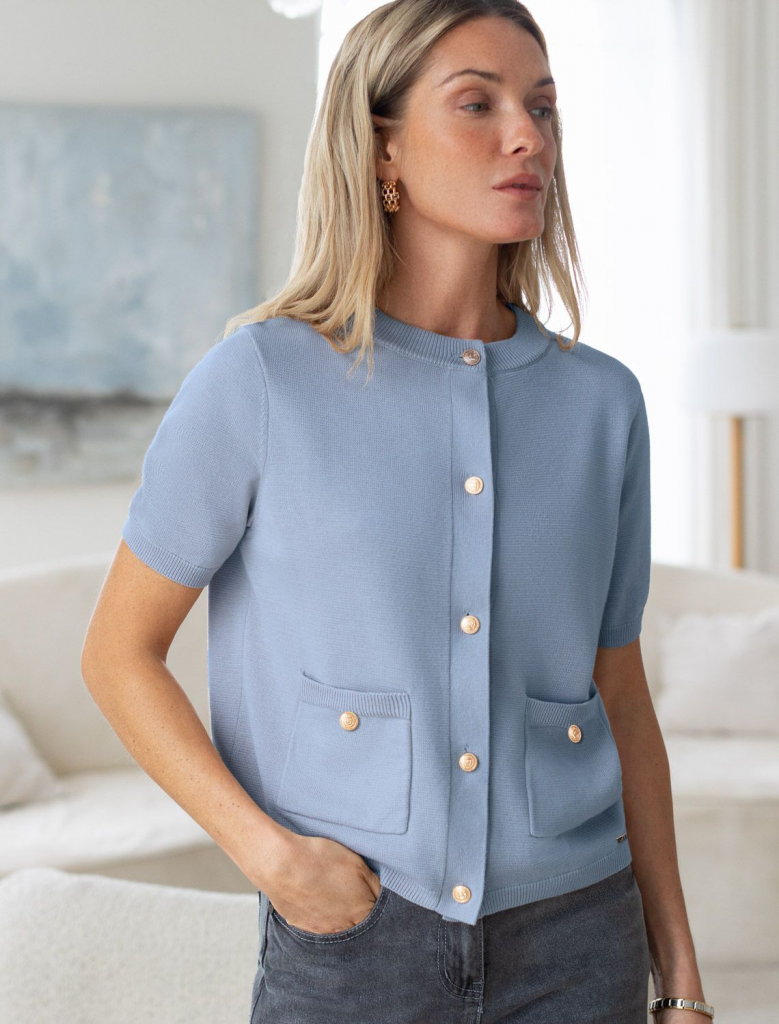 Вязаный кардиган светло-голубого цвета из хлопка с коротким рукавом — отличный выбор для весны и лета. Его женственный крой подчеркивает фигуру, а полуприлегающий силуэт создает аккуратный и стильный образ. Укороченный фасон гармонично сочетается с различными вариантами одежды, позволяя создавать как повседневные в стиле old money, так и более нарядные комплекты. Модель выполнена на пуговицах, что добавляет удобства при носке и делает жакет практичным для разных случаев.Круглый ворот подчеркивает элегантность кардигана, делая его подходящим для офисного или городского стиля. Лаконичный дизайн дополнен карманами — они не только украшают, но и делают повседневный кардиган функциональным и удобным. Благодаря натуральному хлопку жакет обеспечивает комфорт даже в жаркие дни: хлопок позволяет коже дышать и поддерживает оптимальный микроклимат. А акрил в составе придает мягкость, отличную цветостойкость, а также гипоаллергенность и устойчивость к деформации, что делает кардиган легким в уходе.Женственный крой выгодно смотрится на любой фигуре, в том числе и больших размерах, а аккуратная отделка придает особую изысканность. Такой жакет идеально подойдет для прогулок по городу, работы или важных мероприятий.