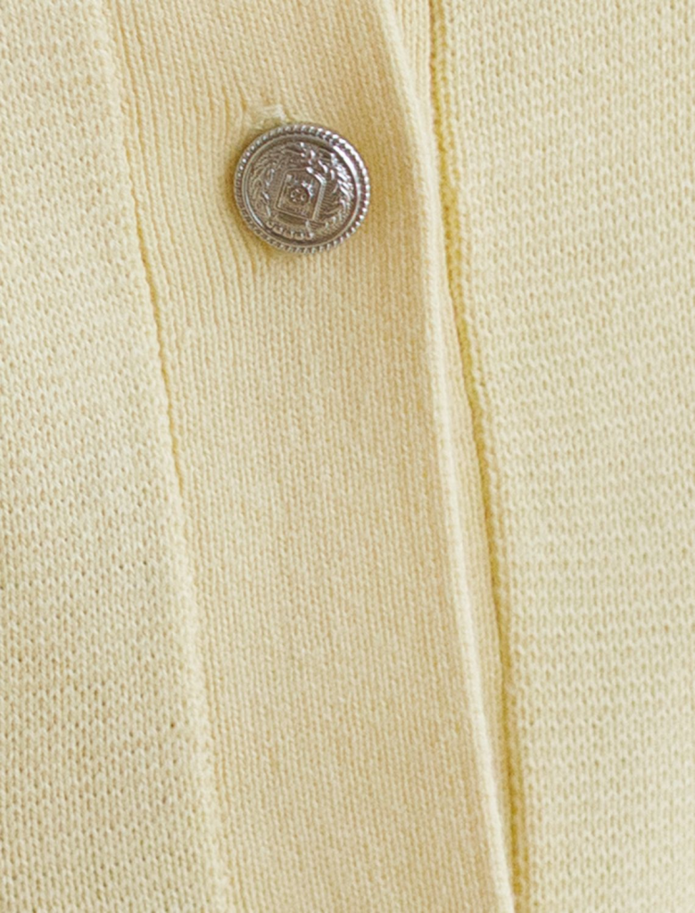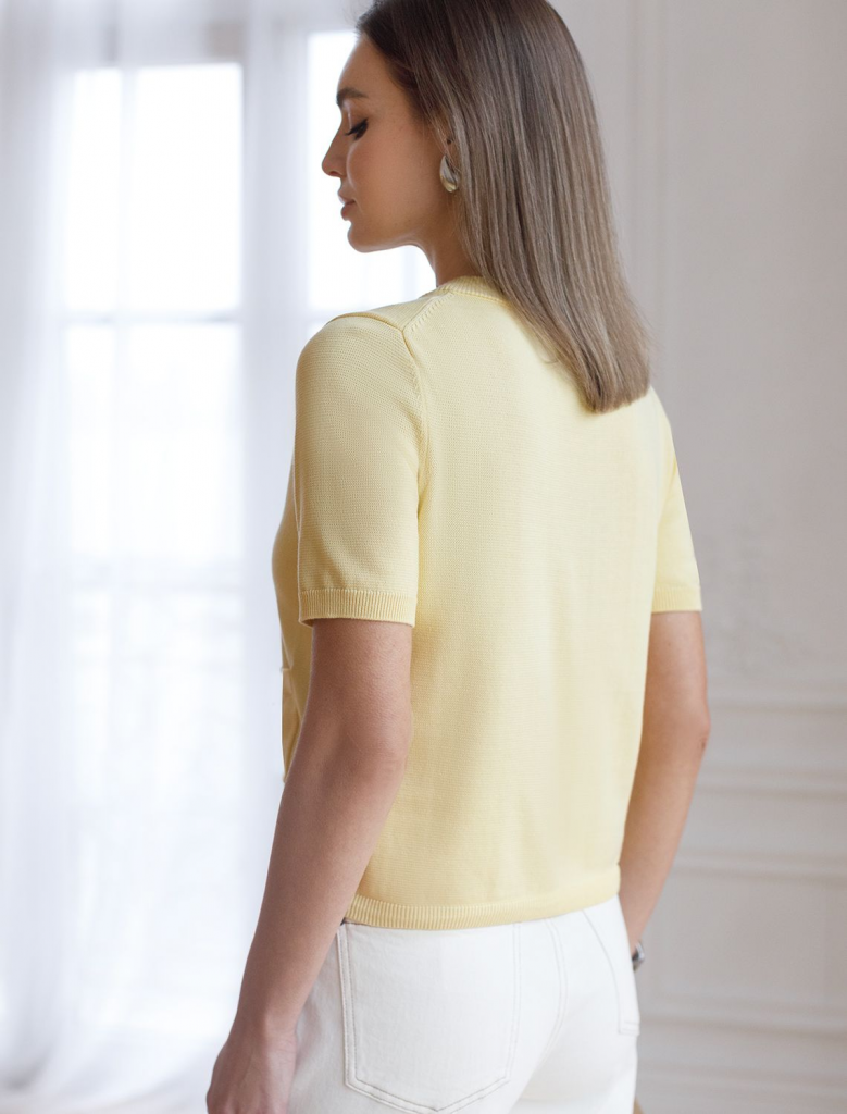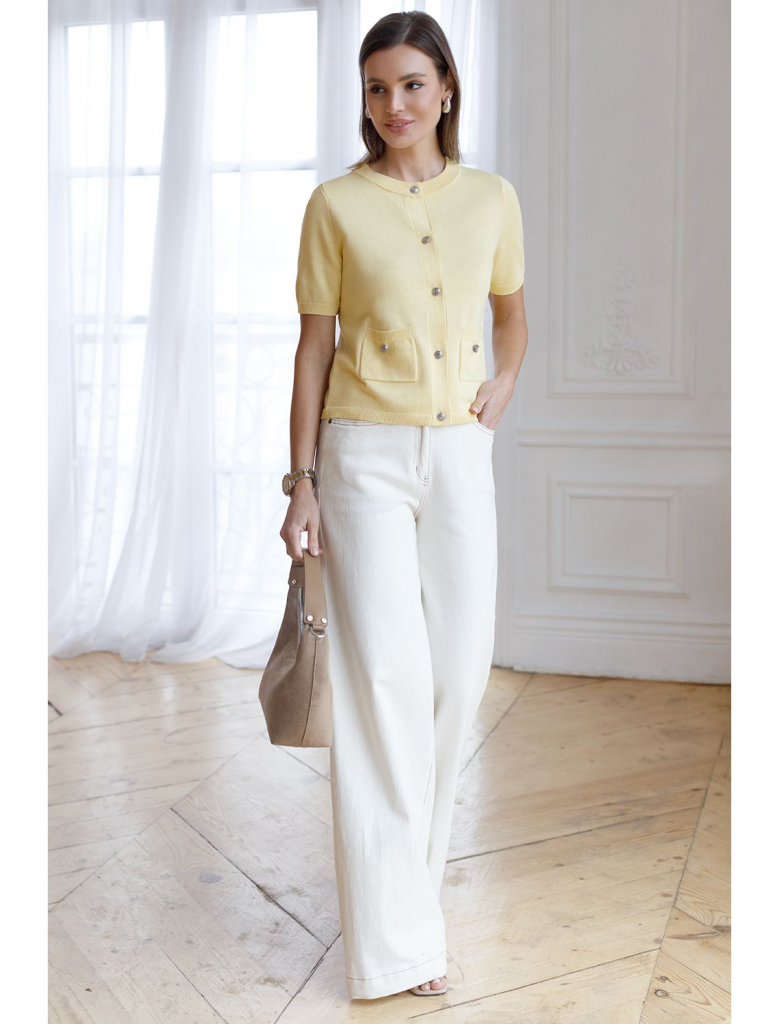 Вязаный кардиган светло-желтого цвета из хлопка с коротким рукавом — отличный выбор для весны и лета. Его женственный крой подчеркивает фигуру, а полуприлегающий силуэт создает аккуратный и стильный образ. Укороченный фасон гармонично сочетается с различными вариантами одежды, позволяя создавать как повседневные в стиле old money, так и более нарядные комплекты. Модель выполнена на пуговицах, что добавляет удобства при носке и делает жакет практичным для разных случаев.Круглый ворот подчеркивает элегантность кардигана, делая его подходящим для офисного или городского стиля. Лаконичный дизайн дополнен карманами — они не только украшают, но и делают повседневный кардиган функциональным и удобным. Благодаря натуральному хлопку жакет обеспечивает комфорт даже в жаркие дни: хлопок позволяет коже дышать и поддерживает оптимальный микроклимат. А акрил в составе придает мягкость, отличную цветостойкость, а также гипоаллергенность и устойчивость к деформации, что делает кардиган легким в уходе.Женственный крой выгодно смотрится на любой фигуре, в том числе и больших размерах, а аккуратная отделка придает особую изысканность. Такой жакет идеально подойдет для прогулок по городу, работы или важных мероприятий.