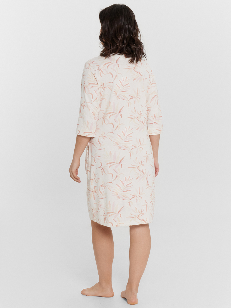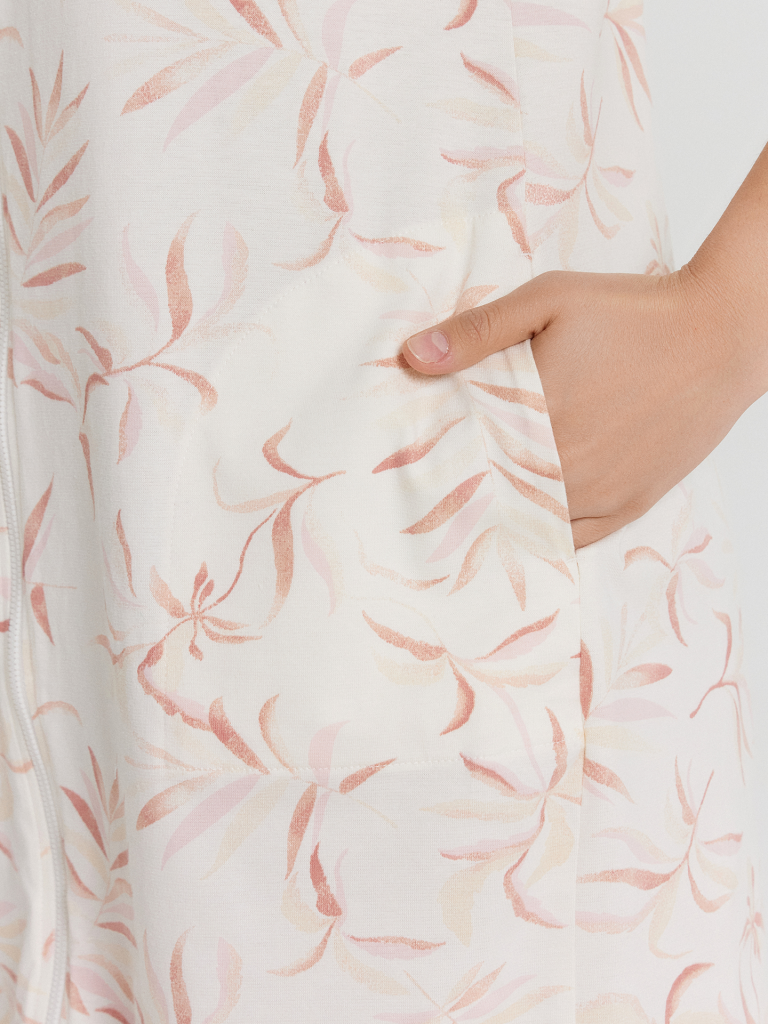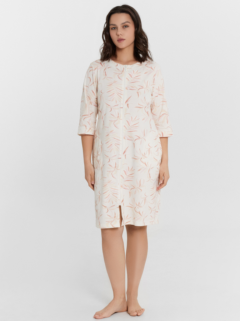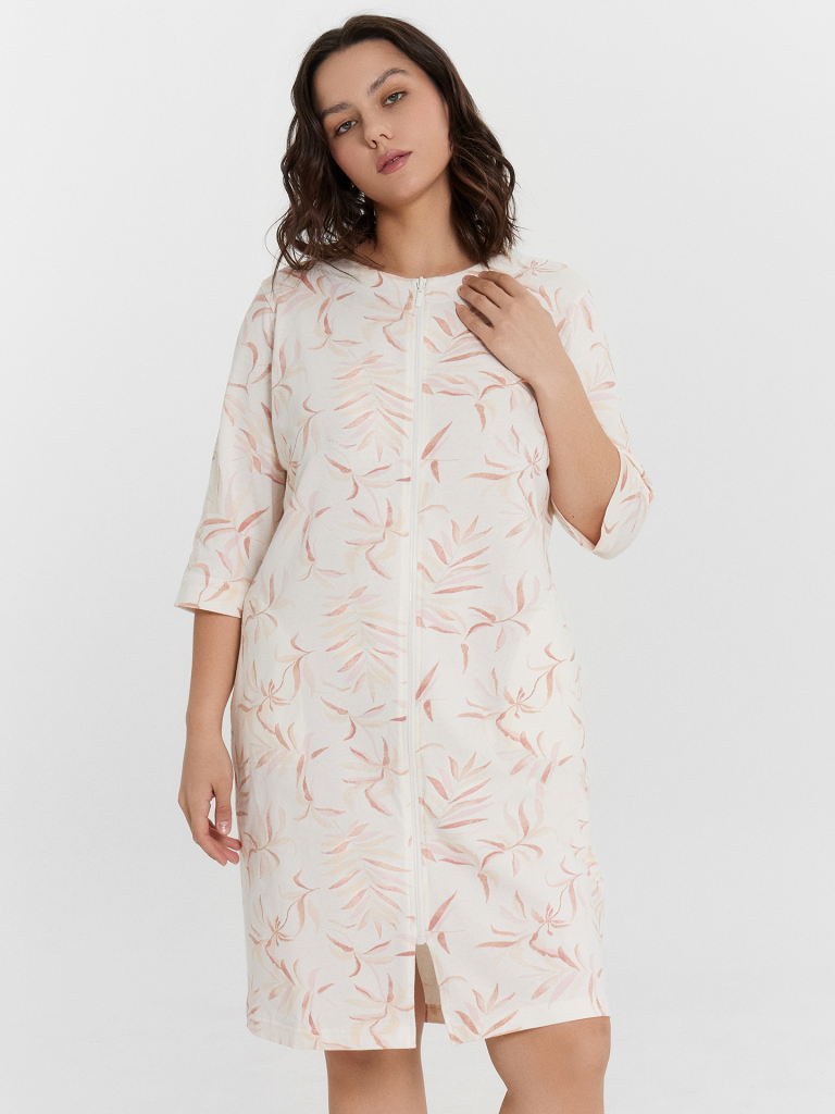 Красивый женский халат с коротким рукавом из высококачественного хлопка станет идеальным выбором для вашего гардероба. Прямой силуэт и длина ниже колена обеспечивают элегантный и уютный вид, а застежка на молнию спереди делает модель удобной в использовании. Два функциональных и вместительных боковых кармана добавляют практичности. Хлопок является отличным материалом для халатов, так как он хорошо впитывает остатки влаги, быстро сохнет и позволяет коже дышать. Надевайте халат после бани, сауны, СПА, ванны и душа - в нем всегда тепло и уютно. Этот халат идеально подходит для беременных и кормящих девушек, а также для роддома. Широкая линейка домашней одежды Mark Formelle предлагает красивые варианты в базовых цветах и с различными принтами. Купите этот халат для уютного и комфортного времяпрепровождения дома и порадуйте себя и своих близких красивой домашней одеждой от Mark Formelle!