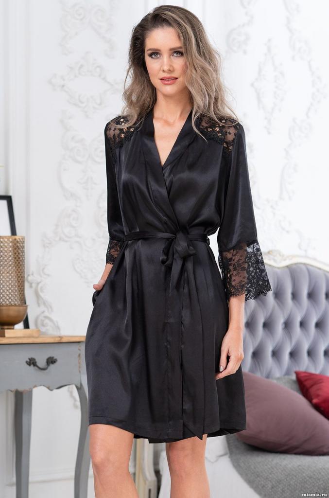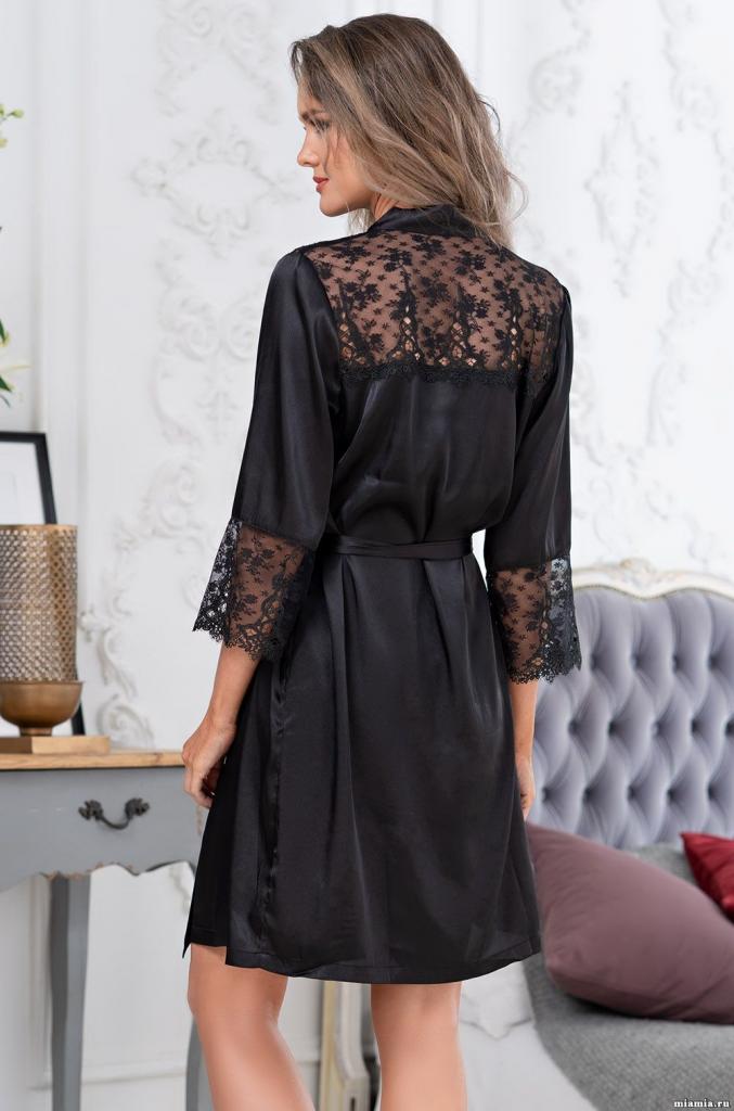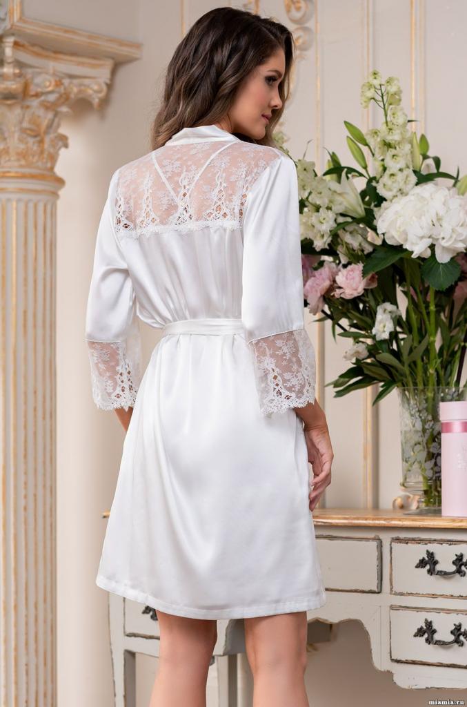 Элегантный запашной халат Mia-Amore с рукавами длиной ¾, выполнен из смесового однотонного шелка. Вставки из французского кружева украшают кокетки полочек и спинки, а также низ рукавов. По бокам обработаны карманы.
