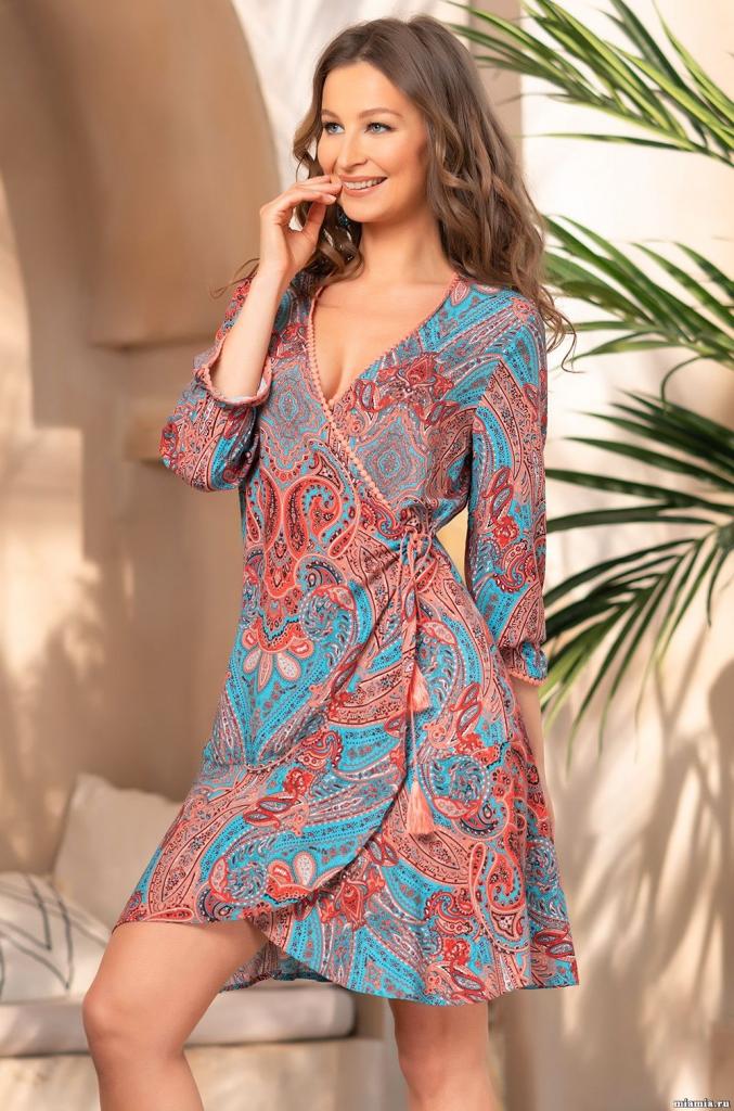 Платье-халат с запахом и завязкой вокруг талии Mia-Amore выполнен из принтованного вискозного полотна. Халат с рукавами длиной ¾ сосборены на резинку и оформлены по низу воланчиком с кружевом. Низ изделия также оформлен воланом, пояс украшен кисточками, вырез горловины хлопковое кружево.
