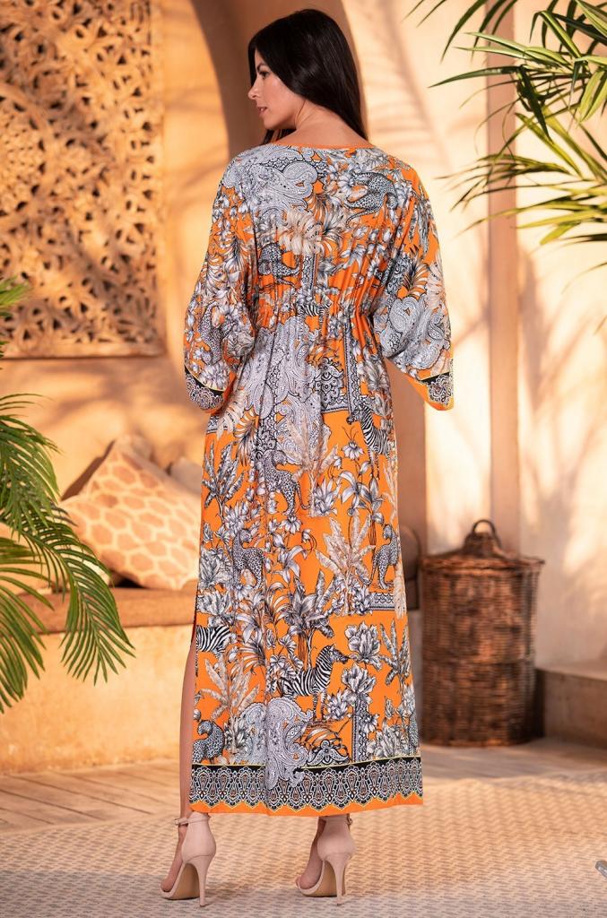 Длинная распашная туника на завязках Mia-Amore выполнена из принтованной вискозы. Кулиска регулирует тунику по ширине, завязки украшены золотыми декоративными гепардами.