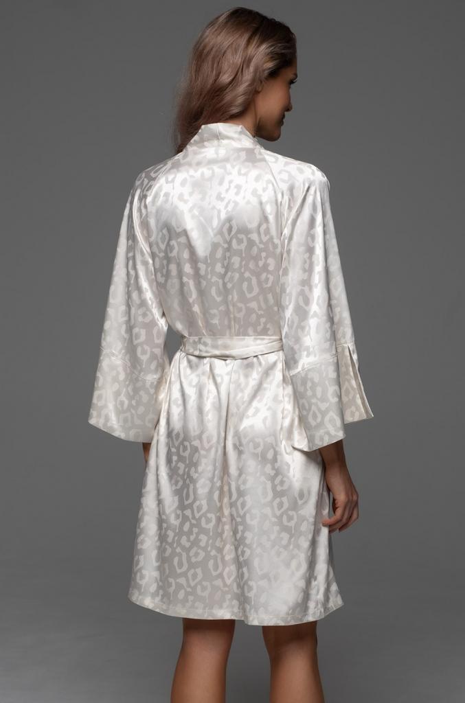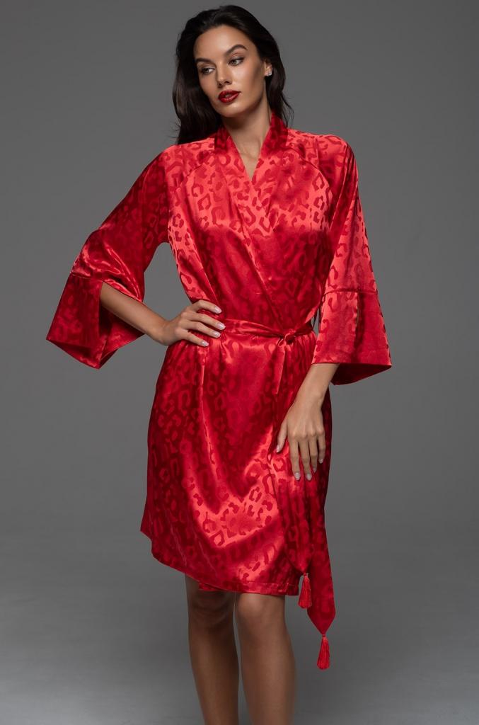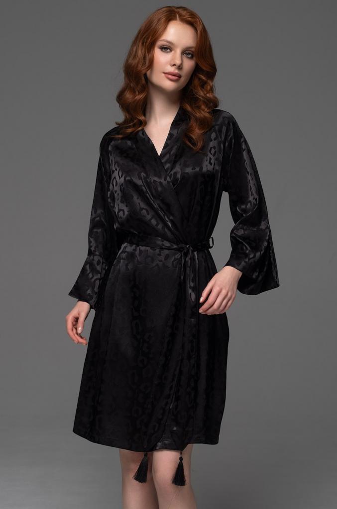 Короткий халат-кимоно Mia-Amore с широкими рукавами длиной ¾. Изделие выполнено из искусственного шелка на жаккардовой основе. По бокам расположены карманы. В комплекте широкий пояс с кисточками.
