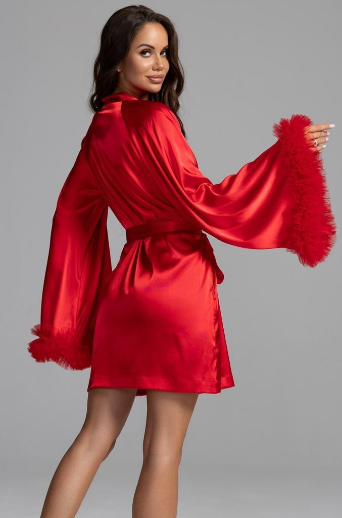 Короткий халат Mia-Amore выполнен из мягкого искусственного шёлка. Рукава запашного халата по низу украшены пышной многослойной сетчатой рюшей. В боковых швах халата карманы. Халат запахивается с помощью широкого пояса.
