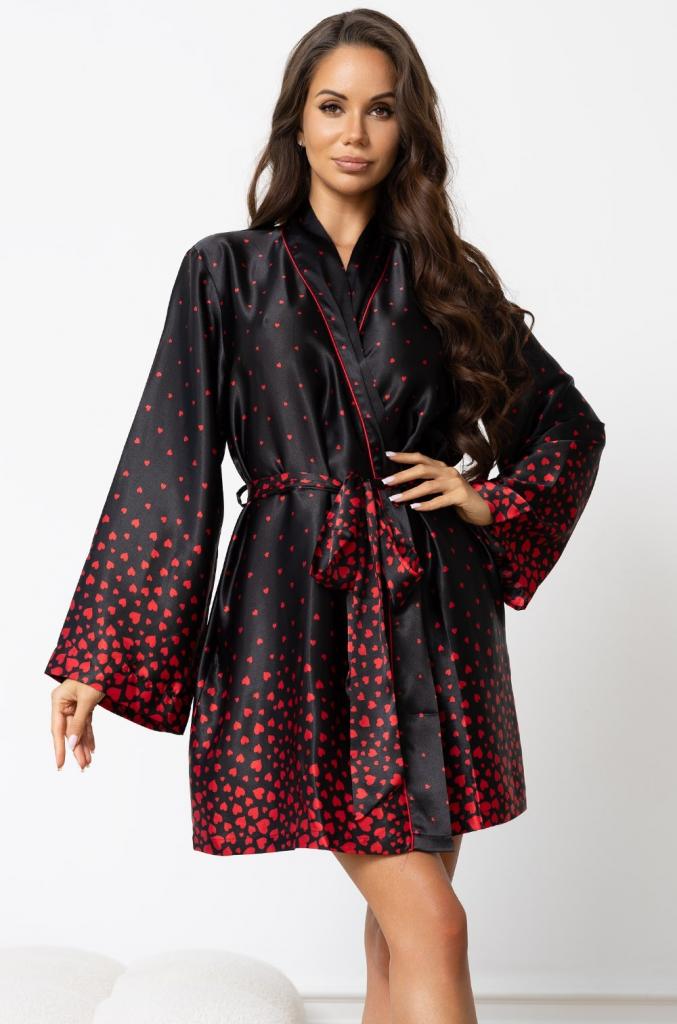 Короткий запашной халат Mia-Amore с длинными рукавами выполнен из принтованного искусственного шёлка. Рукава по низу и низ халата украшены сердечками в виде принта. Халат комплектуется широким поясом, в боковых швах карманы.