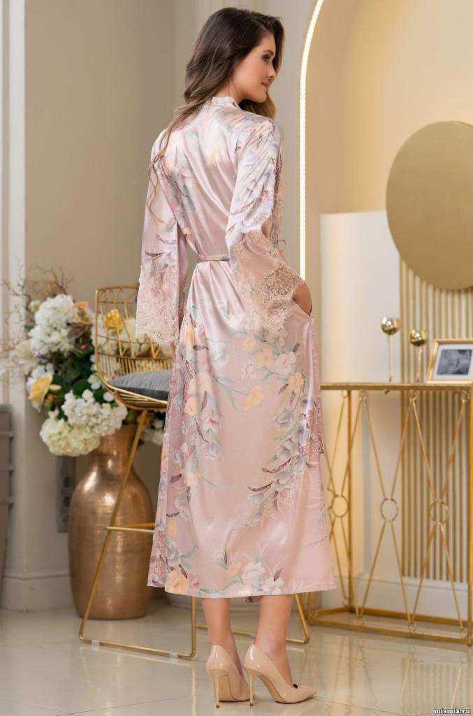 Длинный классический запашной халат Mia-Amore с рукавом длиной 7/8, выполнен из принтованного смесового шелка и декорирован ажурным кружевом, которое расположено по низу рукавов. Контрастный кант подчеркивает линию борта. По бокам обработаны карманы.