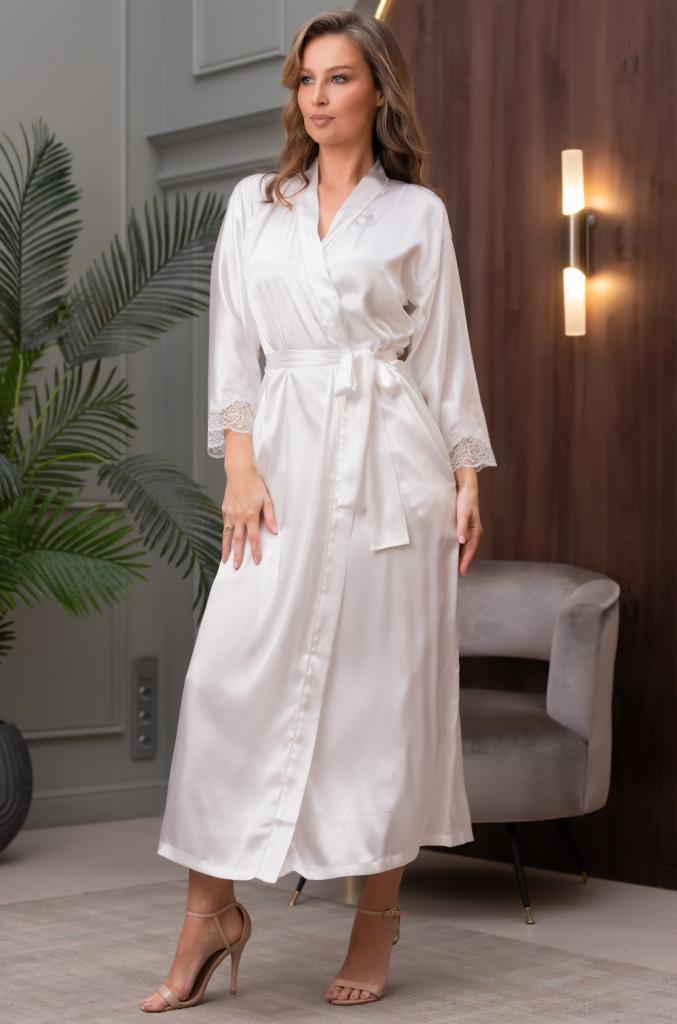 Длинный халат Mia-Amore выполнен из смесового шелкового полотна. Низ рукавов декорирован тонким кружевом, вырезанным по форме кружева кромка ткани придает удивительную воздушность модели. Дизайн коллекции - студия Angelo Bellini (Milano)