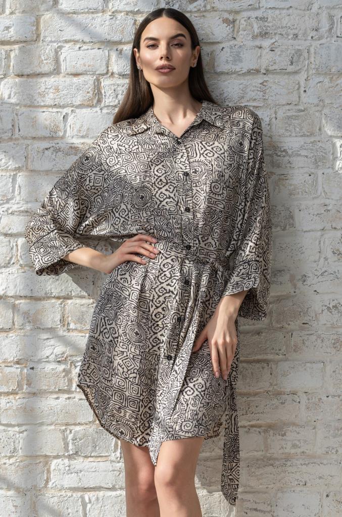 Короткая рубашка Mia-Amore свободного силуэта с длинным рукавом и фигурной линией низа. В боковых швах обработаны карманы. Линию талии можно подчеркнуть за счет пояса, который идет в комплекте. Изделие выполнено из принтованного смесового шелка (шелк 58%+вискоза 42%) с отделкой в виде контрастного канта по низу рукавов.
