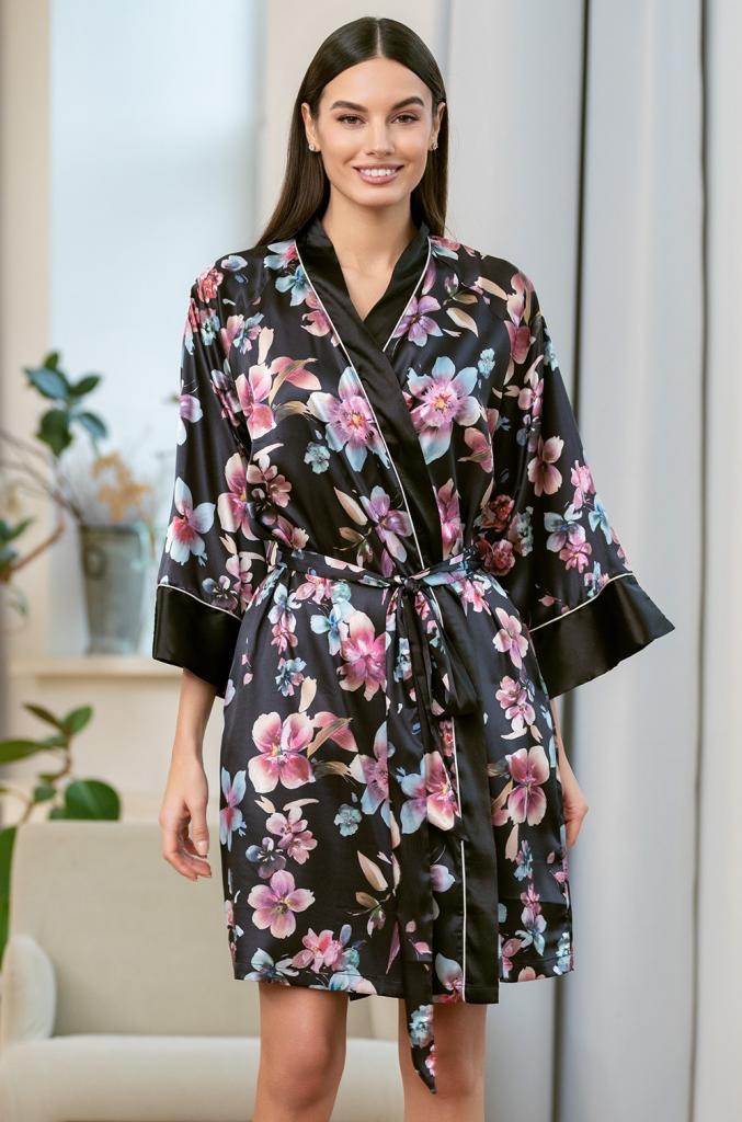 Короткий запашной халат Mia-Amore с широким рукавом длиной 3/4. Халат выполнен из принтованного смесового шелка с однотонной отделкой и контрастными кантами по бортам и низу рукавов. По бокам халата обработаны карманы.