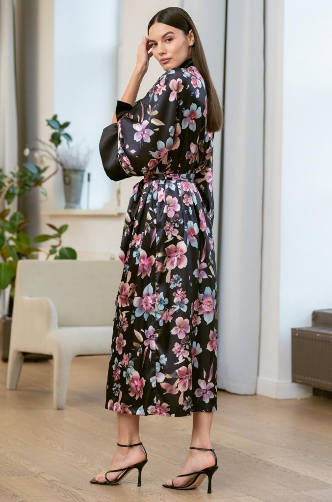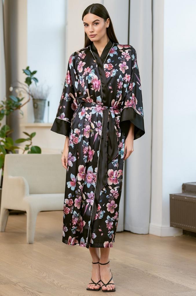 Длинный халат-кимоно Mia-Amore с широким длинным рукавом. Халат выполнен из принтованного смесового шелка с однотонной отделкой и контрастными кантами по бортам и низу рукавов. По бокам халата обработаны карманы.