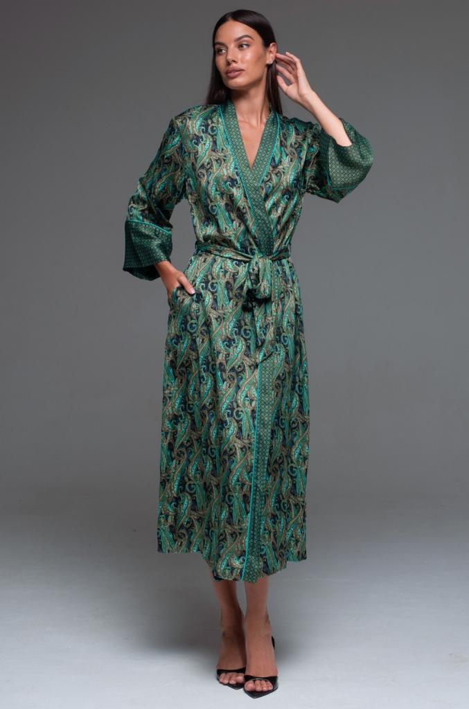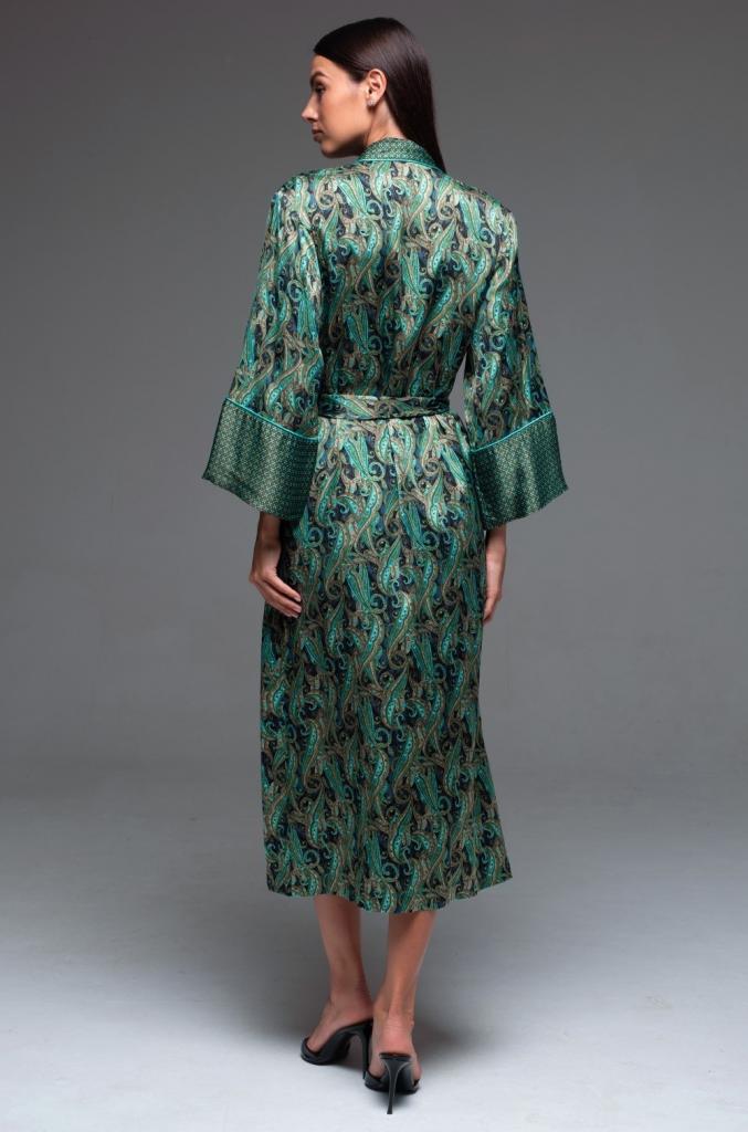 Длинный запашной халат Mia-Amore выполнен из принтованного смесового полотна. Низ рукавов украшает манжета из компаньона с бирюзовым кантом. Планка халата также выполнена из компаньона и украшена бирюзовым кантом. Халат запахивается на широкий пояс, в боковых швах расположены карманы.