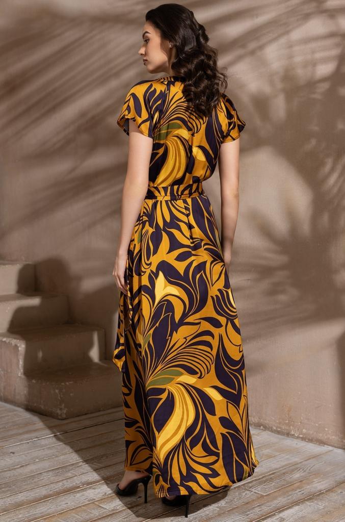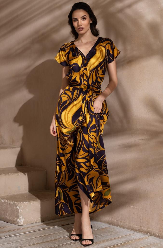 Длинный халат Mia-Amore на пуговицах с коротким рукавом. По бокам обработаны карманы. Изделие выполнено из принтованного смесового шелка. Линию талии можно подчеркнуть за счет пояса, который идет в комплекте.