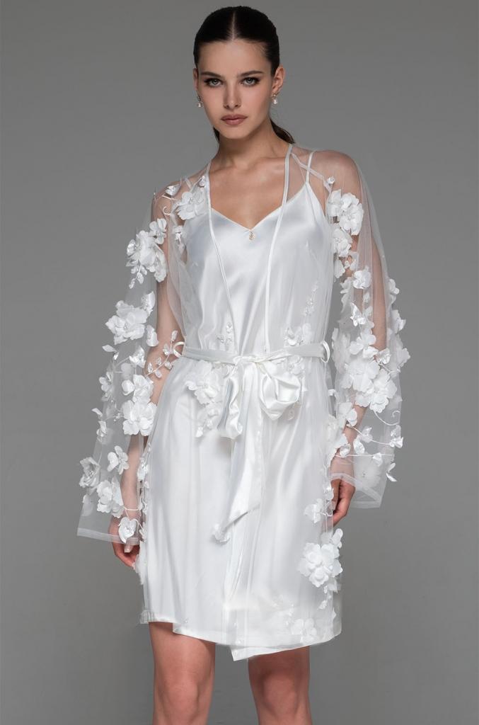Короткий халат Mia-Amore выполнен полностью из мягкой сетки с объёмными цветами. Халат украшают длинные расширяющиеся к низу рукава. Халат декорируется широким атласным пояс поясом.