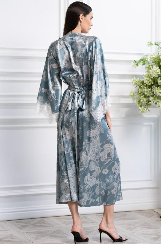 Длинный халат Mia-Amore выполнен из принтованного смесового шёлка. Халат по талии имеет застежку на пуговицы, спереди в рельефах разрезы, на спинке по талии декоративные буфы с резинкой, которые приталивают силуэт изделия, по талии широкий декоративный пояс, который можно завязать назад или вперёд. Рукава халата по низу украшены широким кружевом молочного цвета.