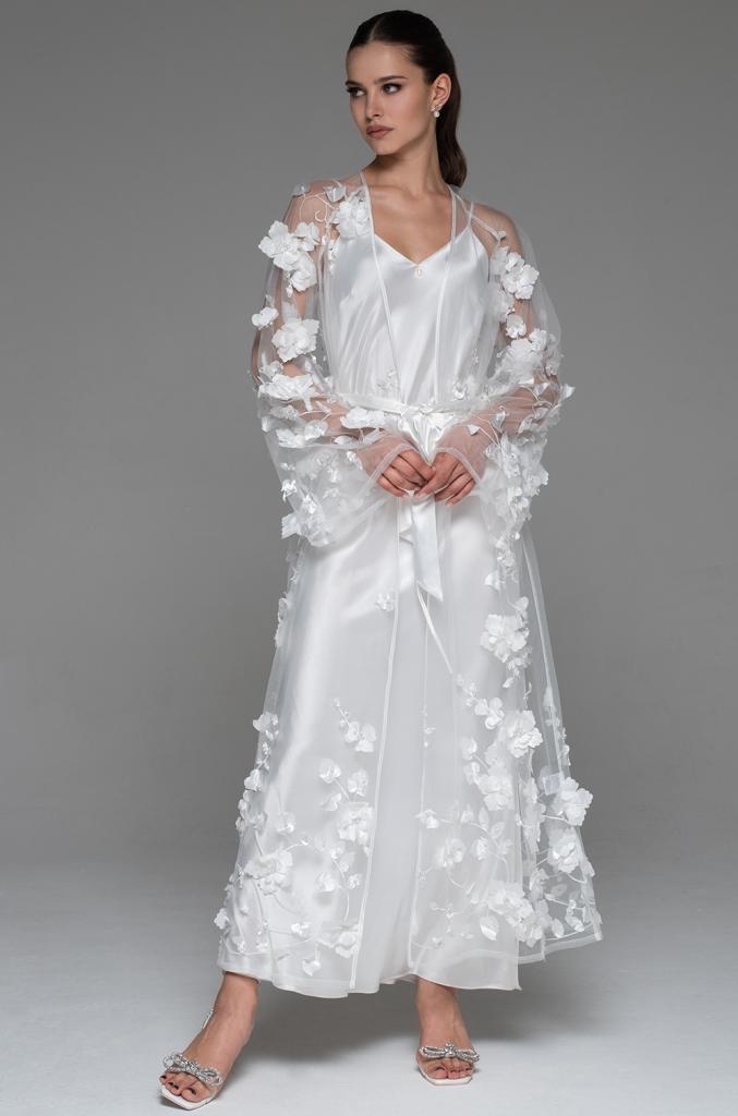 Длинный халат Mia-Amore выполнен полностью из мягкой сетки с объёмными цветами. Халат украшают длинные расширяющиеся к низу рукава. Халат декорируется широким атласным пояс поясом.