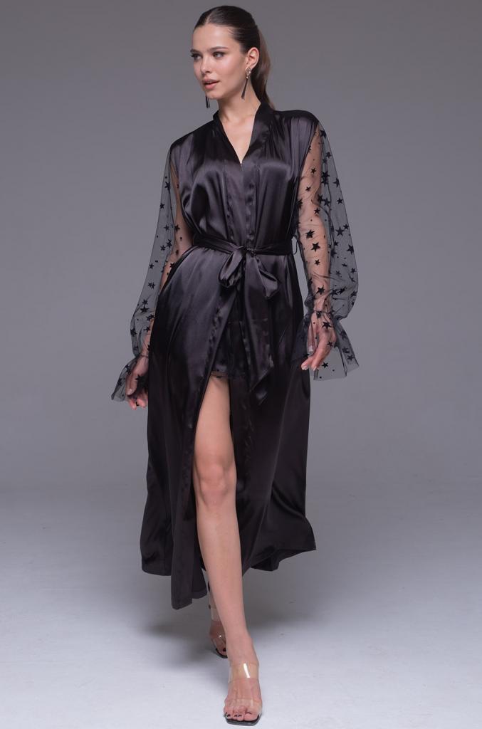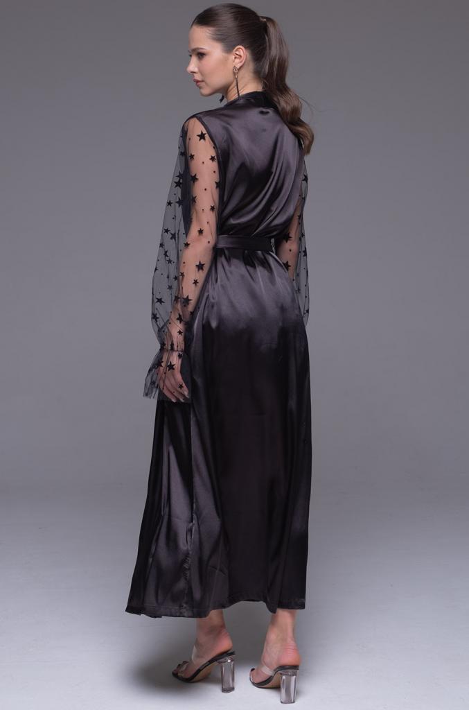 Длинный халат Mia-Amore выполнен из смесового шёлка. Декоративной частью халата являются эффектные широкие рукава из сетки с резинкой по низу и широкой оборкой. Халат запахивается широким атласным поясом.