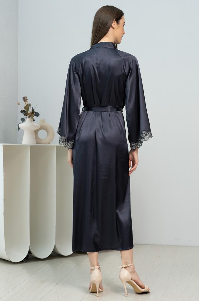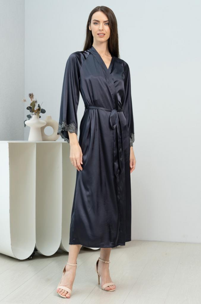 Длинный запашной халат Mia-Amore с широким длинным рукавом. Изделие выполнено из однотонного смесового шелка. Вышивное двухцветное кружево украшает низ рукавов. По бокам расположены карманы.
