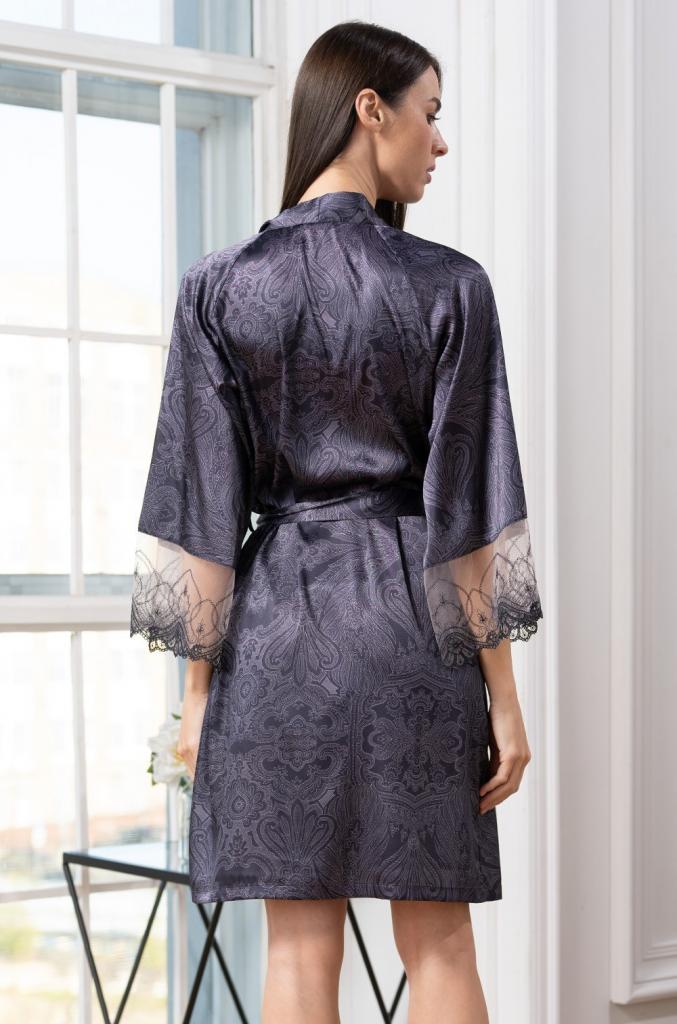 Короткий запашной халат Mia-Amore с широким рукавом длиной 3/4. Халат выполнен из принтованного смесового шелка. Низ рукавов дополнен широким кружевом. По бокам обработаны карманы.