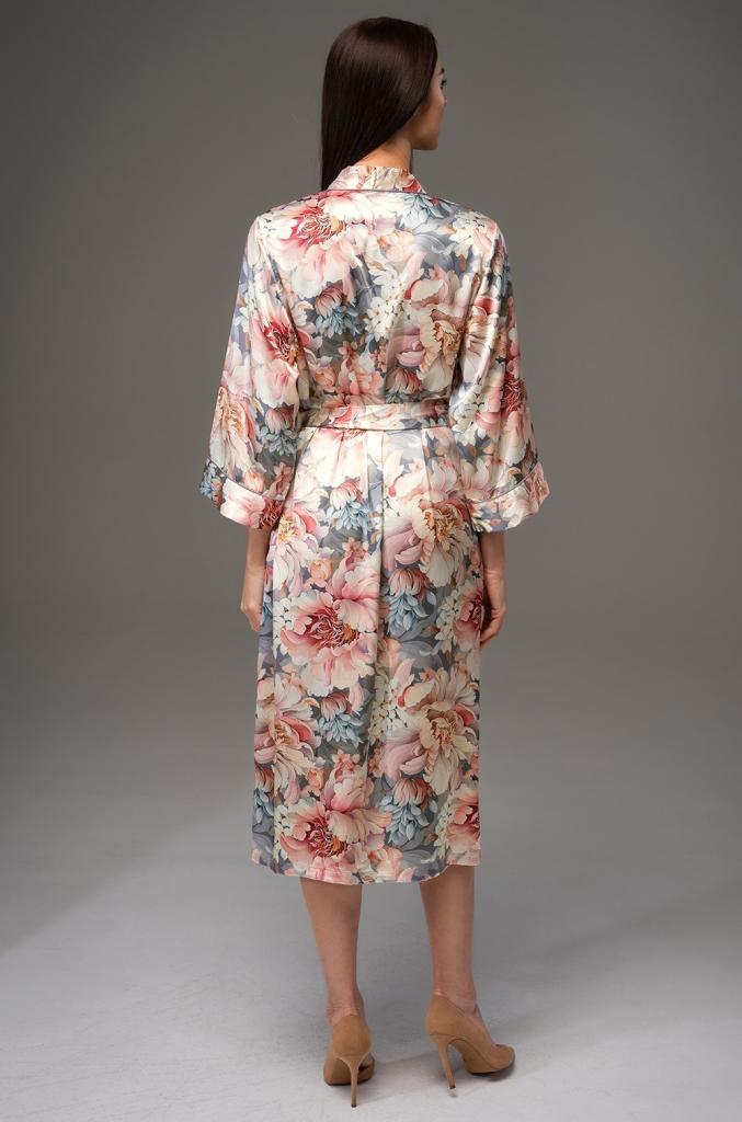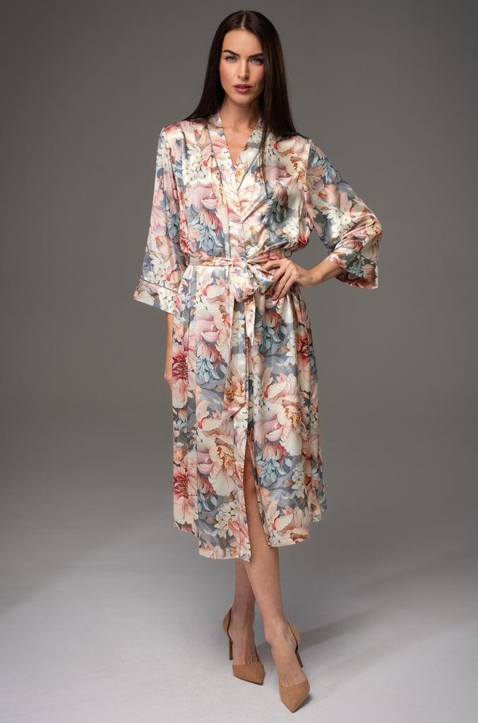 Длинный запашной халат Mia-Amore с широким рукавом длиной 3/4. Халат выполнен из принтованного смесового шелка. Борт и манжеты рукавов декорированы тонким контрастным кантом. По бокам изделия обработаны карманы.
