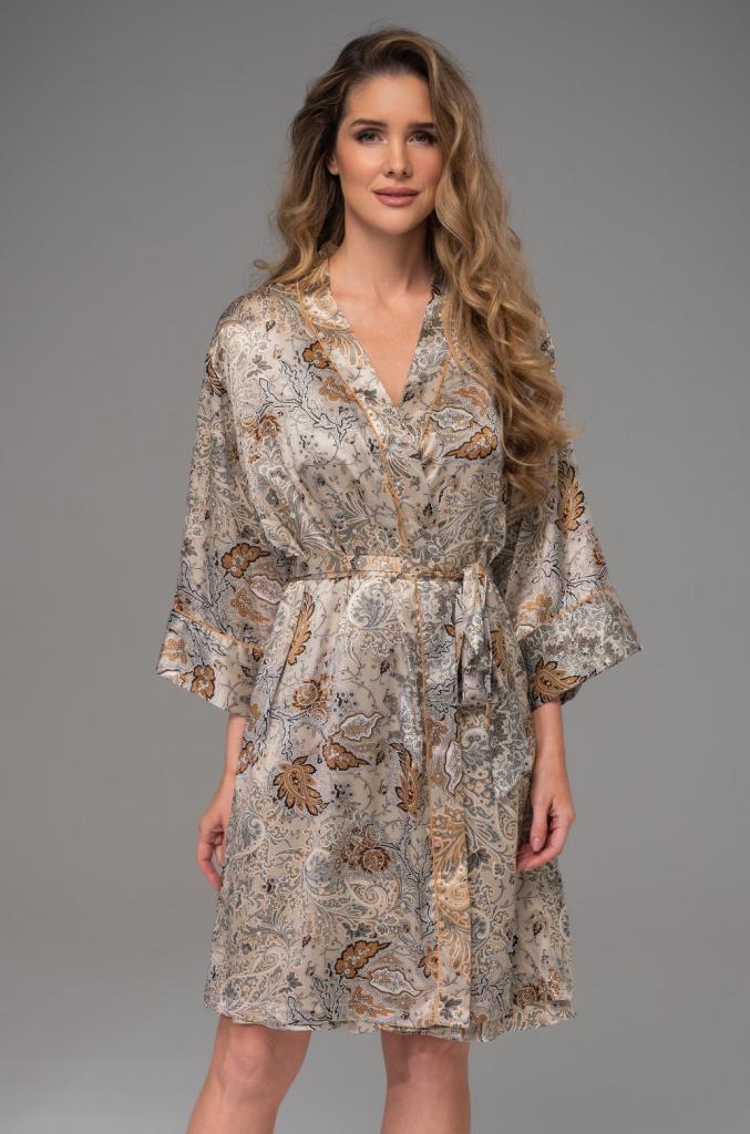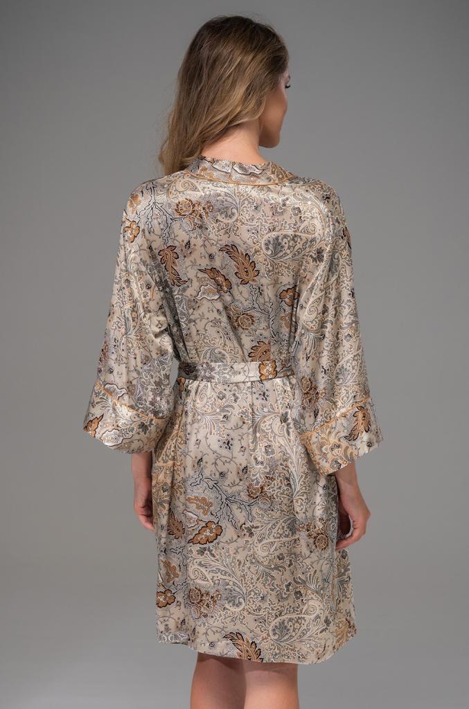 Короткий халат Mia-Amore из принтованного смесового шелка. Борта халата, притачные широкие манжеты на рукавах 7/8 декорированы тонким изящным кантом. В комплекте идет пояс. По бокам халата расположены карманы.