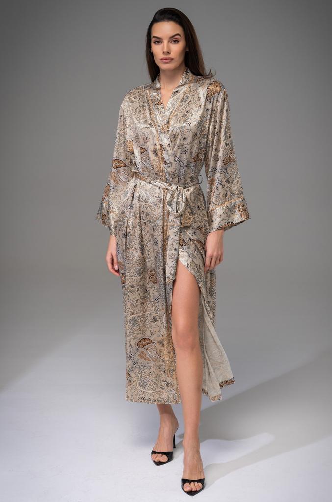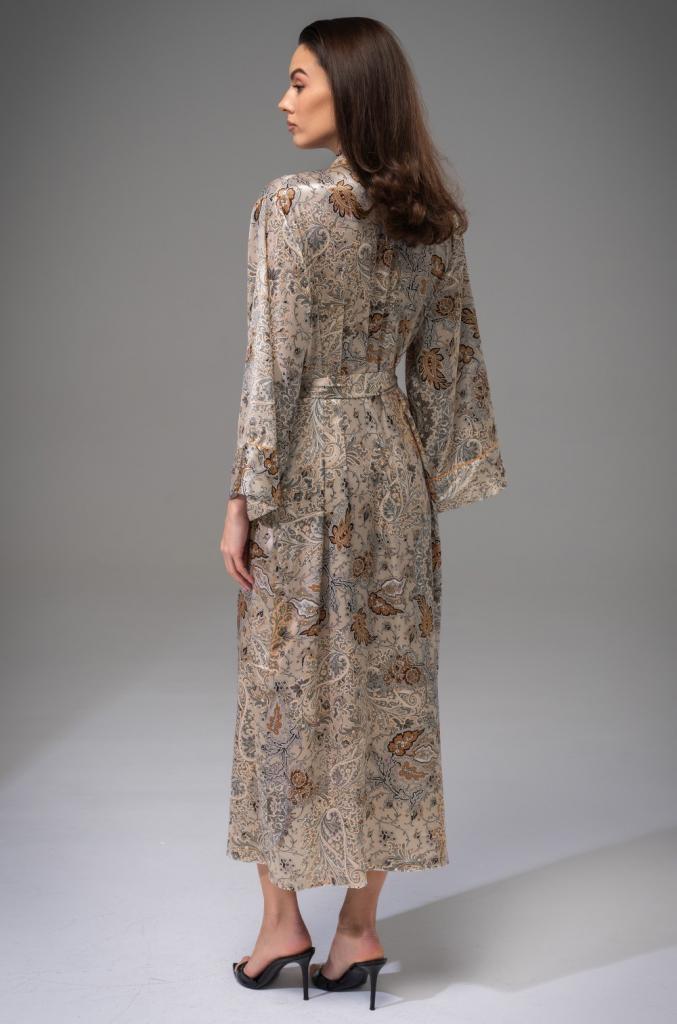 Длинный запашной халат Mia-Amore выполнен из принтованного смесового полотна. Низ рукавов, планка бортов отделаны контрастным кантом. Халат запахивается на пояс, в боковых швах есть карманы.