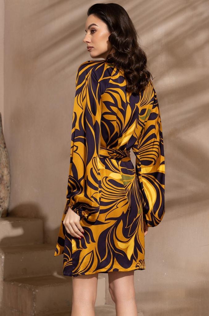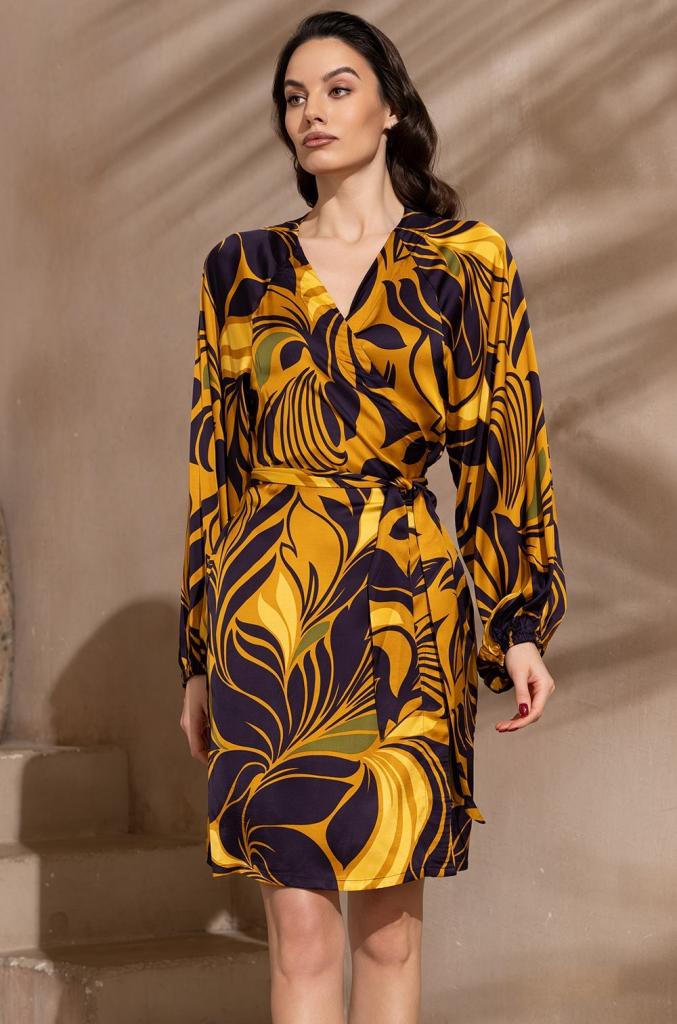 Короткое запашное платье Mia-Amore с длинным объемным рукавом. По бокам расположены карманы. Изделие выполнено из принтованного смесового шелка.