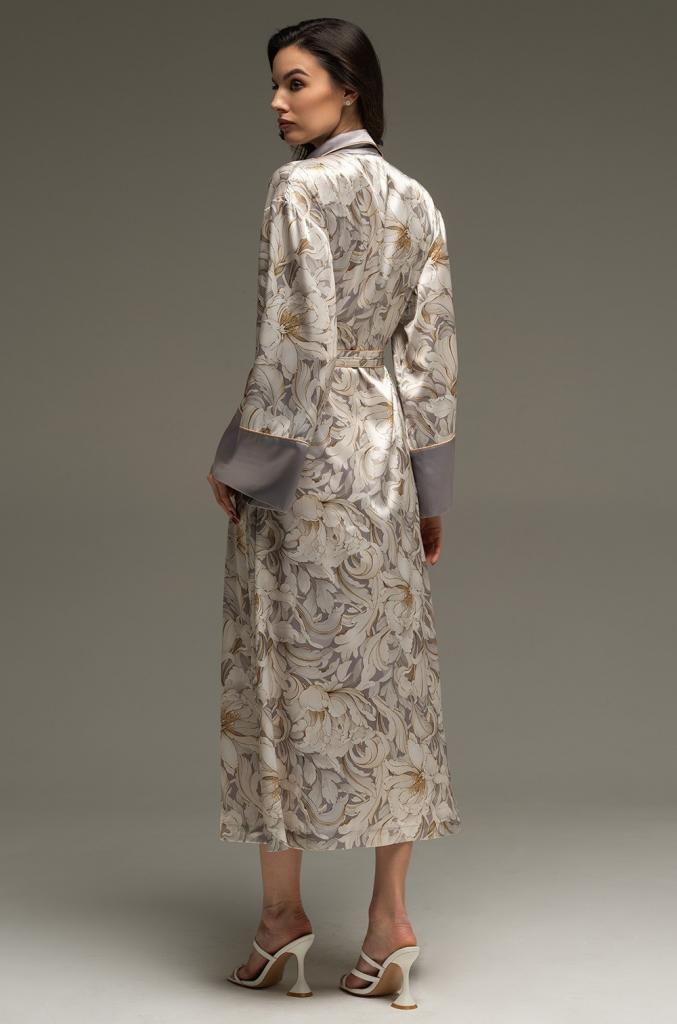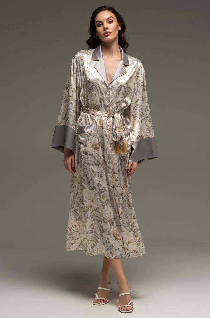 Длинный халат Mia-Amore с центральной застёжкой на пуговицы выполнен из принтованного смесового шёлка. Воротник, манжеты, карманы и пояс украшены тонким золотым кантом. Манжеты и английский воротник выполнены из однотонного атласа. Широкий пояс жакета украшен золотыми кисточками.