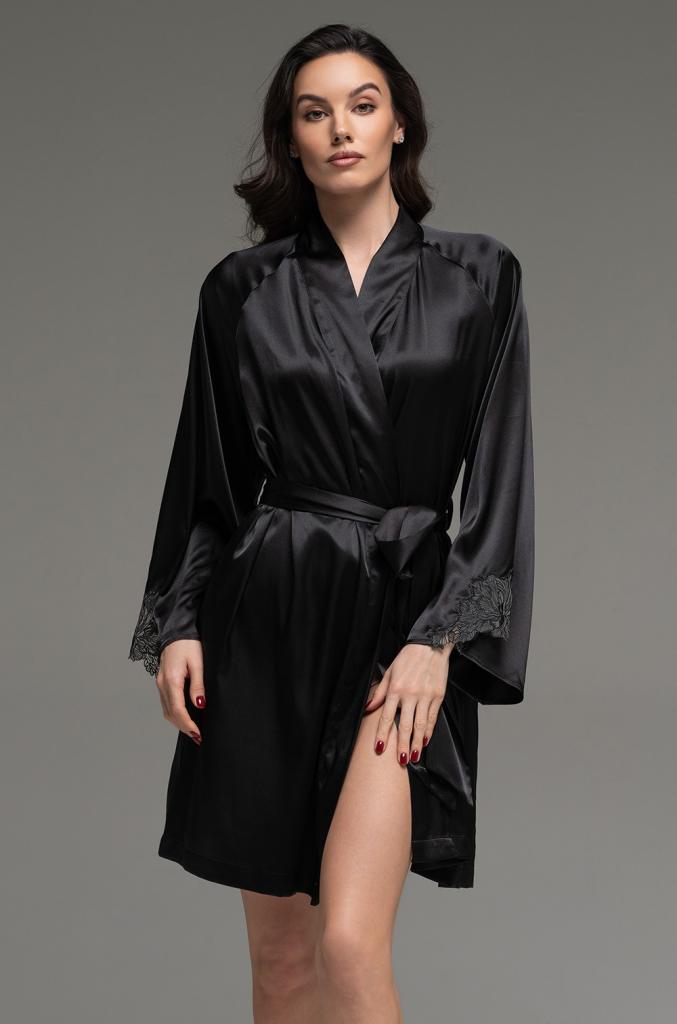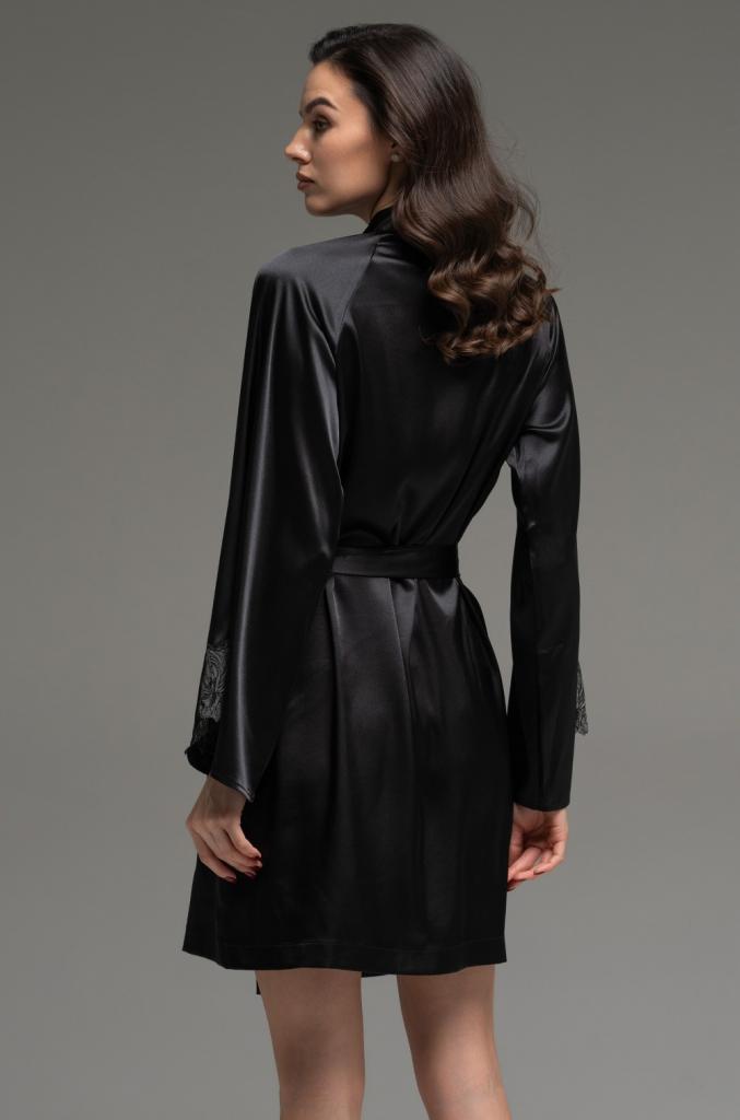 Короткий запашной халат Mia-Amore с длинными рукавами реглан выполнен из однотонного смесового шёлка. По низу рукава украшены ажурными вставками из вышитого кружева. В боковых швах есть карманы. Халат запахивается с помощью широкого съёмного пояса.