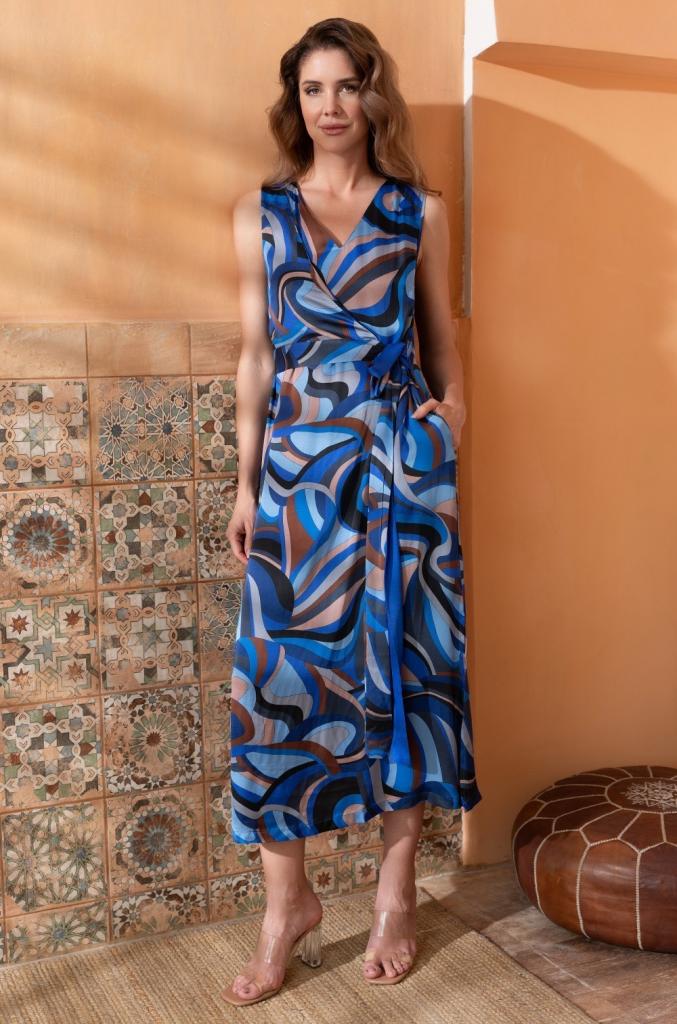 Длинный сарафан Mia-Amore на широких бретелях с запашной кокеткой с правой стороны. По бокам расположены разрезы для свободы движения. Изделие выполнено из принтованного смесового шелка.