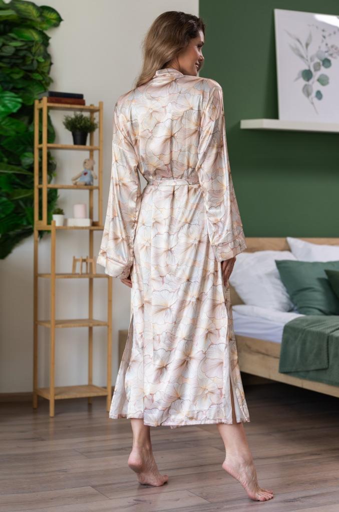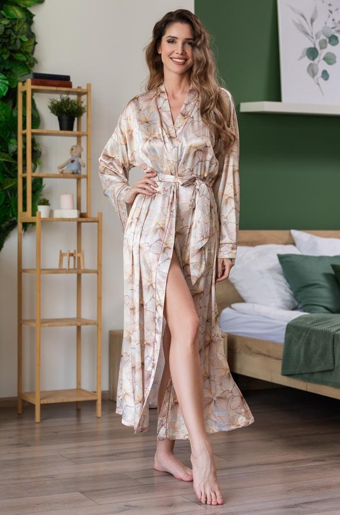 Длинный запашной халат Mia-Amore с широким рукавом длиной 3/4. Халат выполнен из принтованного смесового шелка. Борт и манжеты рукавов декорированы тонким контрастным кантом. По бокам изделия обработаны карманы.