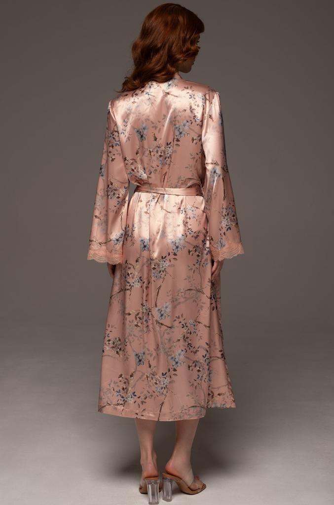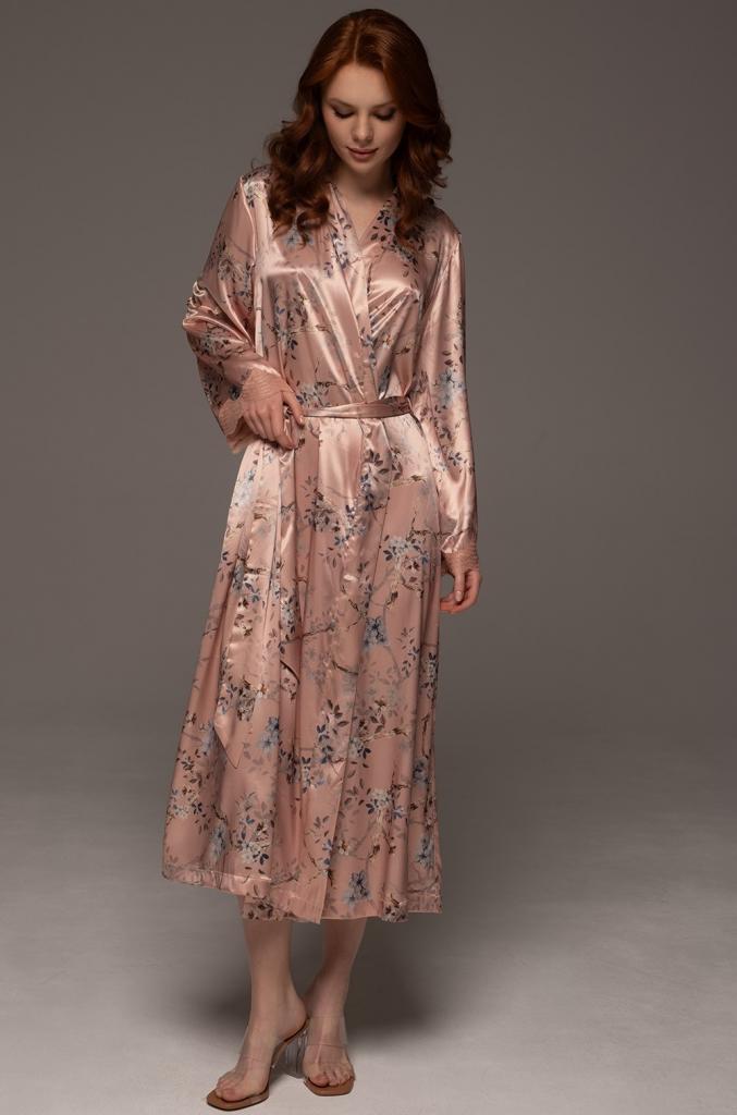 Длинный запашной халат Mia-Amore с длинными рукавами выполнен из принтованного смесового шёлка. Рукава халата по низу декорированы изящным вышивным кружевом. Халат комплектуется поясом, в боковых швах карманы.