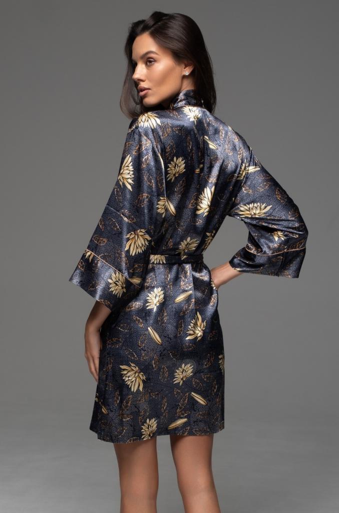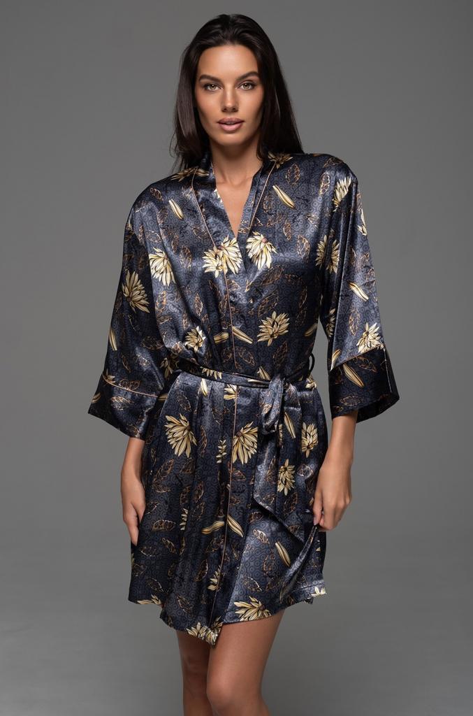 Короткий халат Mia-Amore из принтованного смесового шелка. Борта халата, притачные широкие манжеты на рукавах 7/8 декорированы тонким кантом. В комплекте идет пояс. По бокам халата расположены карманы.