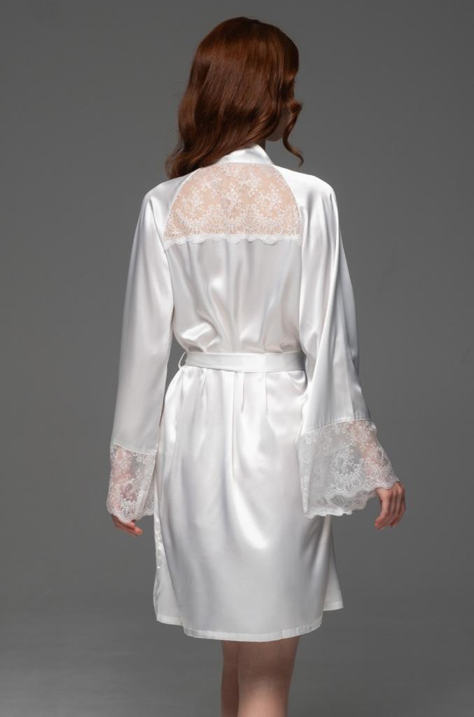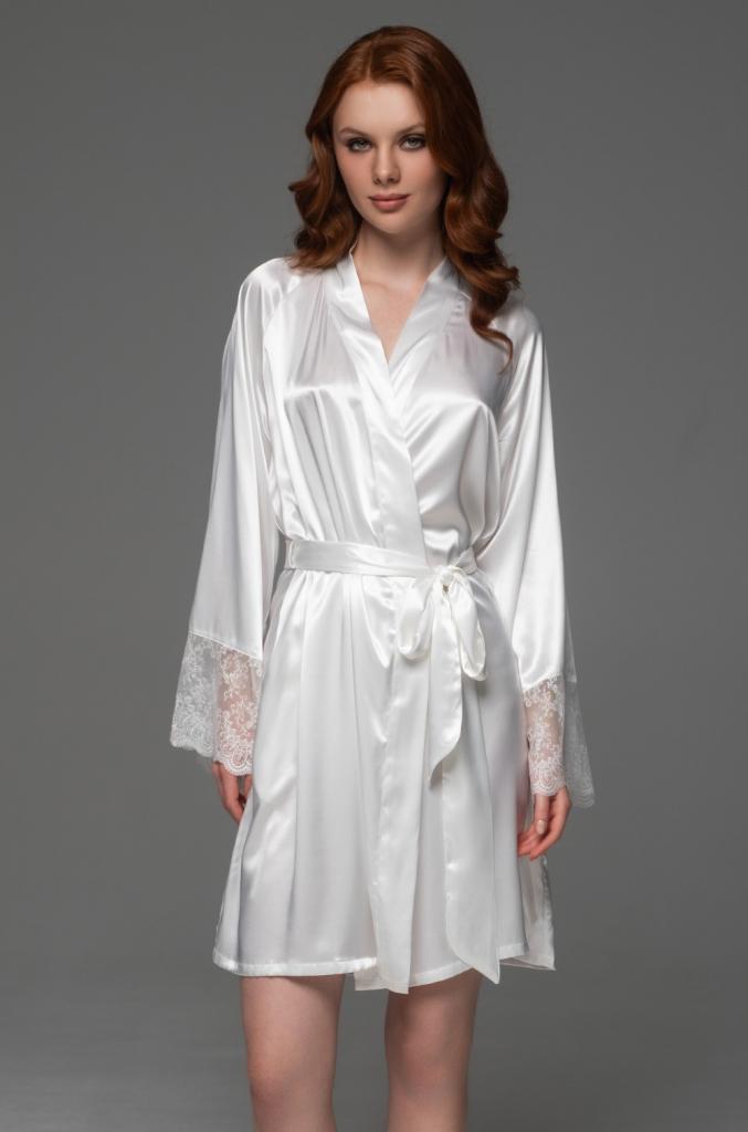 Короткий запашной халат Mia-Amore с длинными рукавами реглан выполнен из однотонного смесового шёлка. По низу рукава украшены широким вышивным кружевом. В боковых швах есть карманы. Халат запахивается с помощью широкого съемного пояса.